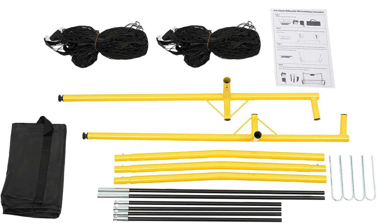 Zawartość zestawu: Metalowe profile, materiał z siatką piłkarską, szpilki mocujące, instrukcję montażu, torba do łatwego przechowywania lub transportu