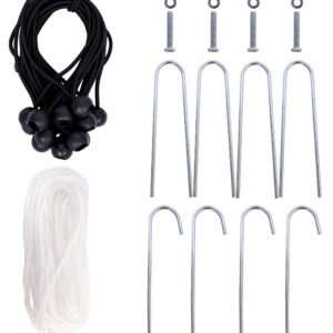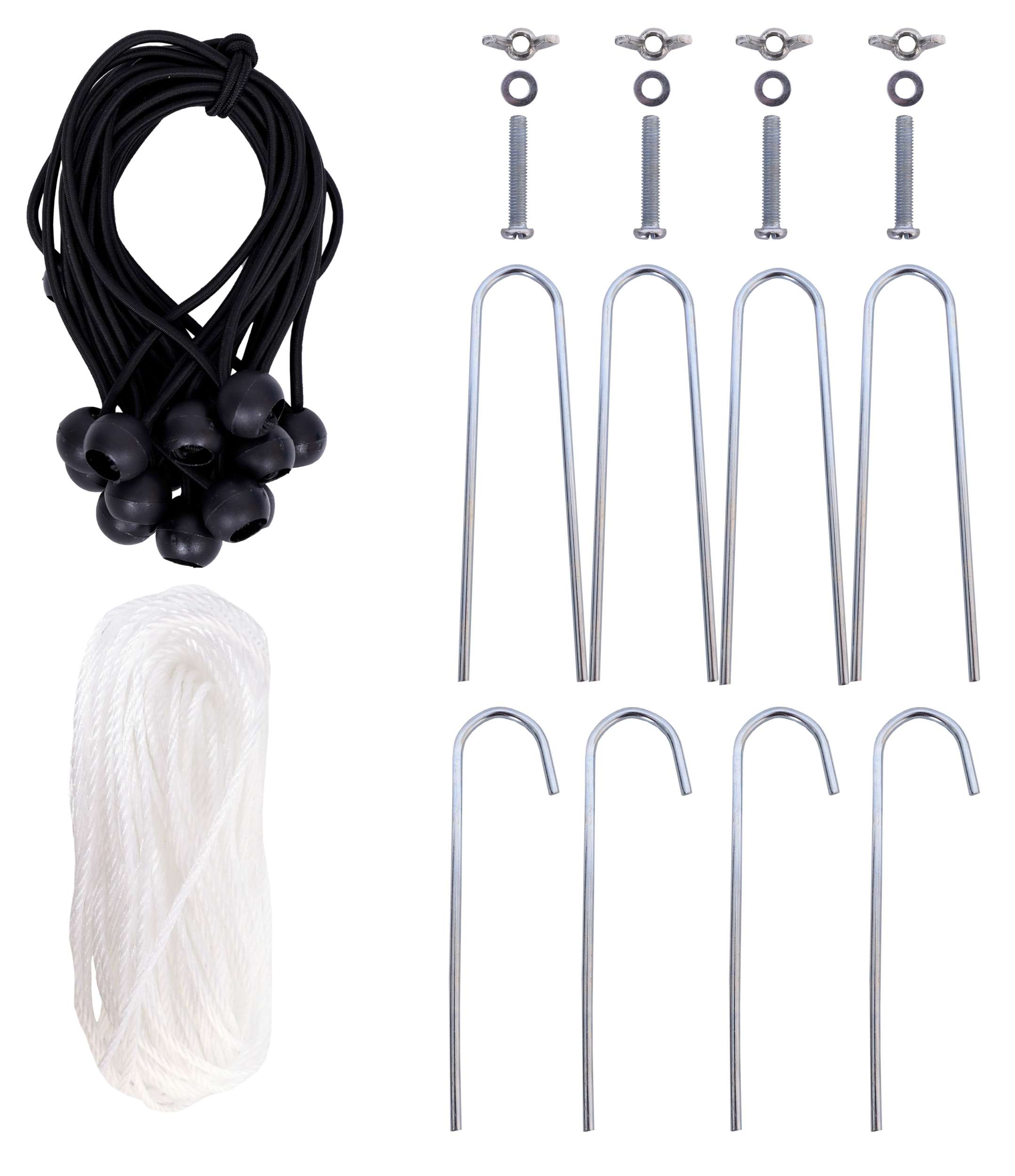 Zestaw zawiera: metalowe profile, śruby z motylkiem, instrukcję w języku polskim, siatkę piłkarską, szpilki mocujące do podłoża, gumowe ściągacze, matę celowniczą.