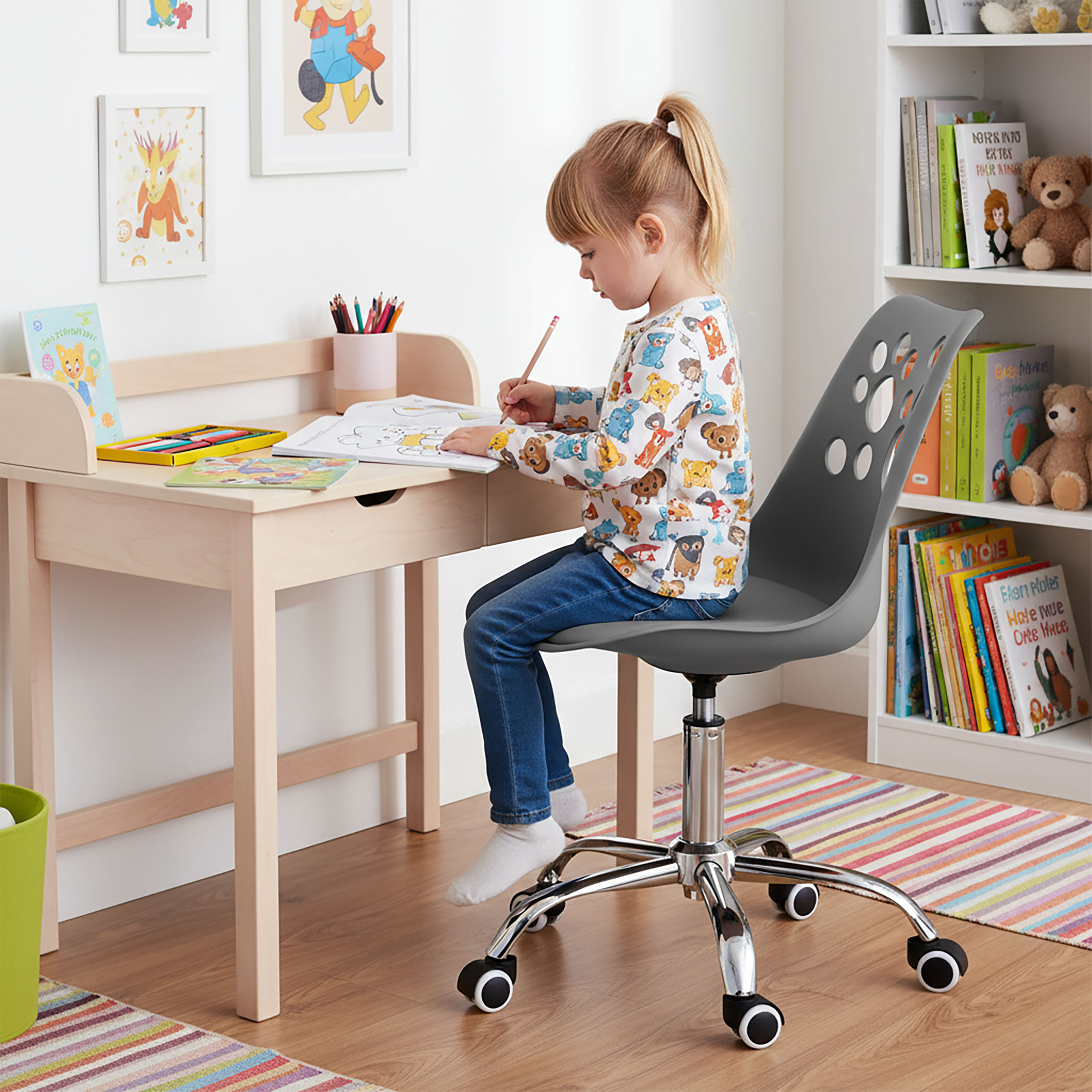 Oparcie profilowane, egronomiczne, dzięki czemu fotel zapewnia wygodę w trakcie zabawy i nauki. Grover jest stabilny i dzięki gumowanym kółkom, także bardzo cichy.