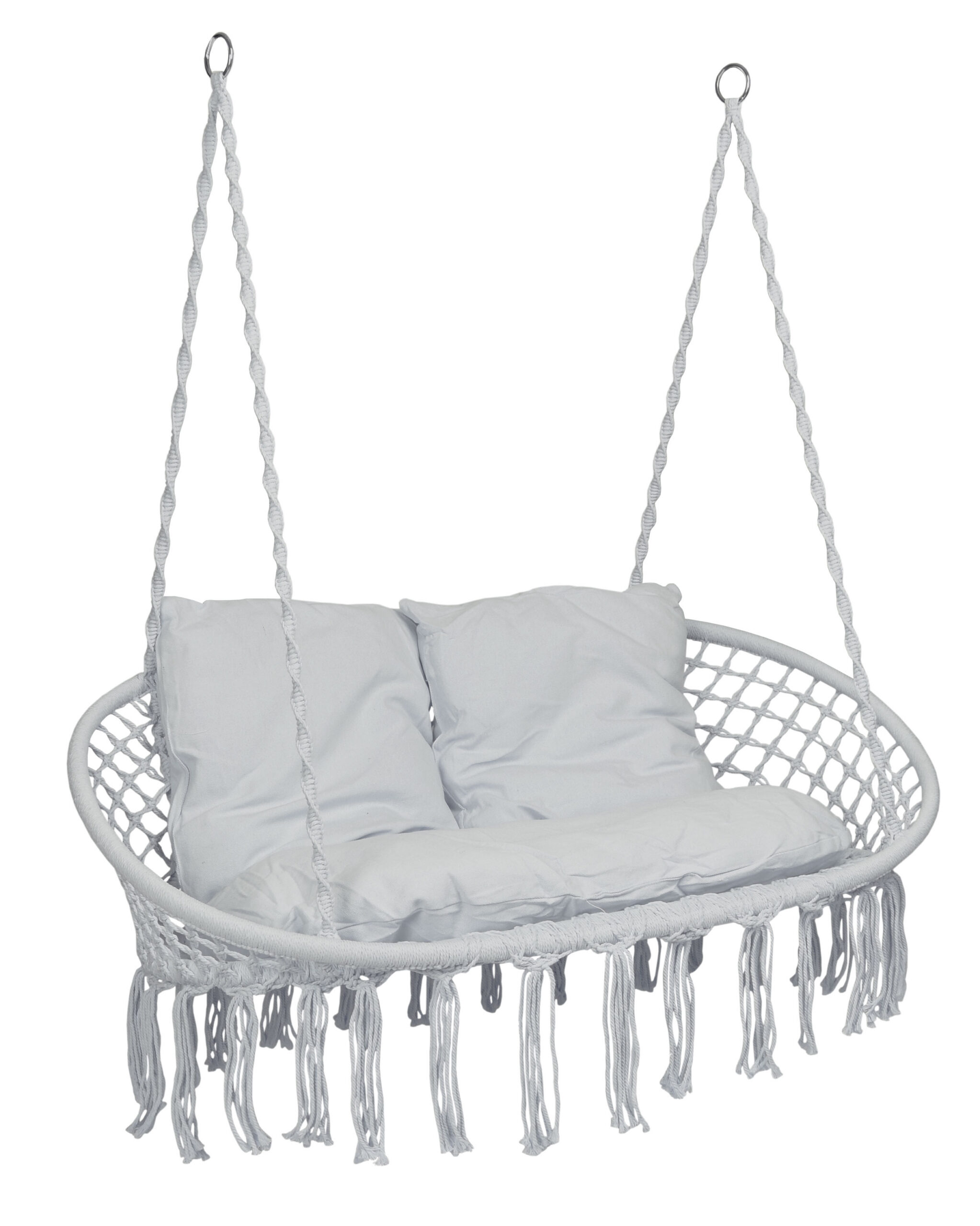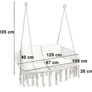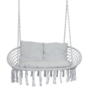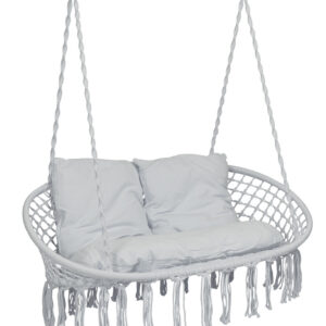 Huśtawka ogrodowa Lagos to najnowszy trend wnętrzarski. Idealna do wypoczynku we dwoje, ma udźwig aż 300kg. Stalowa rama została pokryta pięknymi splotami w stylu boho. Sznury utrzymujące wygodne siedzisko zwieńczone są metalowymi pierścieniami, co znacznie ułatwia jedno- lub dwupunktowy montaż huśtawki. Miękkie poduszki dołączone do zestawu tworzą miłą dla oka kompozycję i znacząco poprawiają komfort użytkowania.