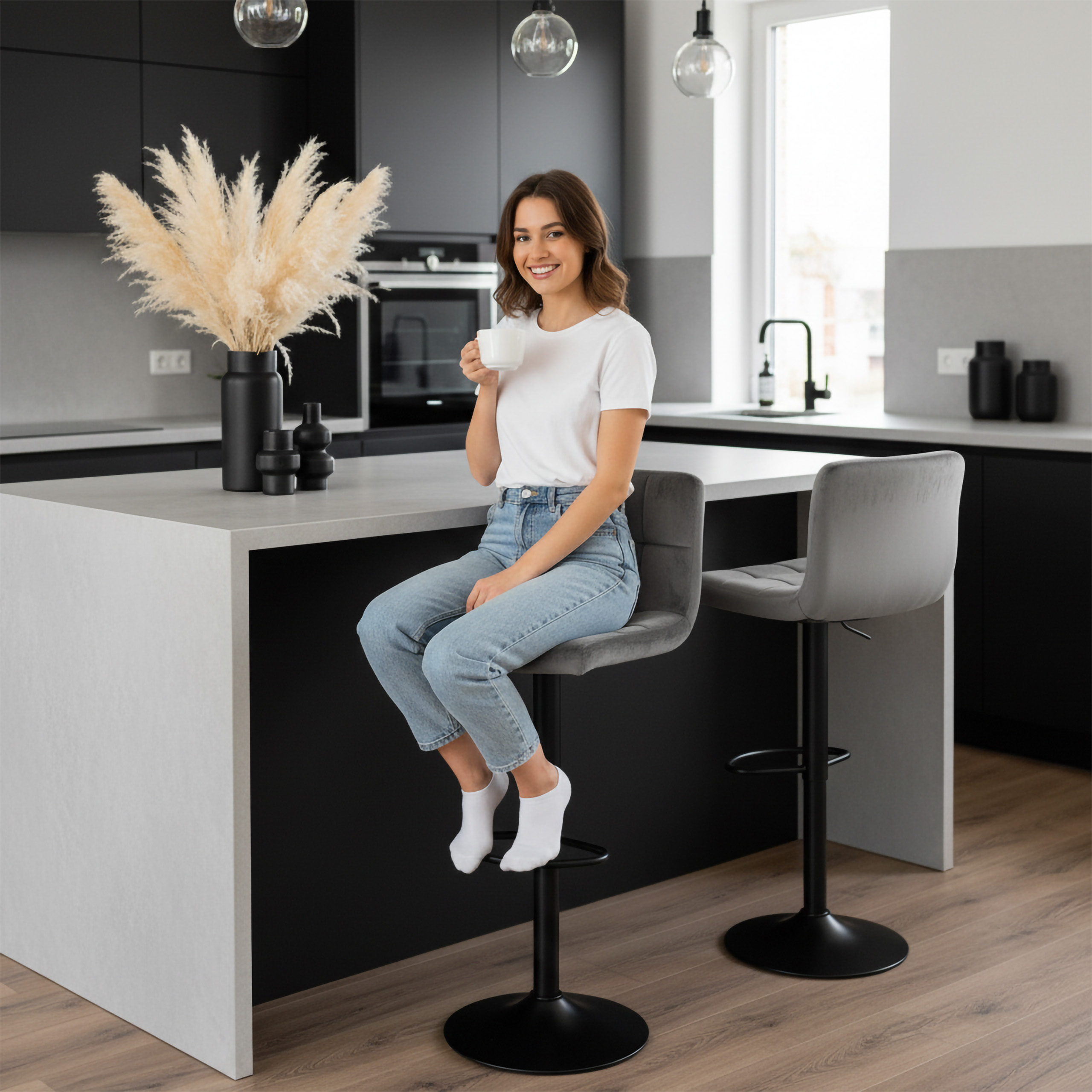 ✅Czarne elementy – Czarne elementy dodają hokerowi nowoczesnego charakteru oraz eleganckiego wykończenia, co sprawia, że jest on wyjątkowo atrakcyjnym elementem wystroju wnętrza. Ich połyskująca powierzchnia efektownie kontrastuje z welurową tapicerką, nadając całej konstrukcji ekskluzywnego i nowoczesnego wyglądu.