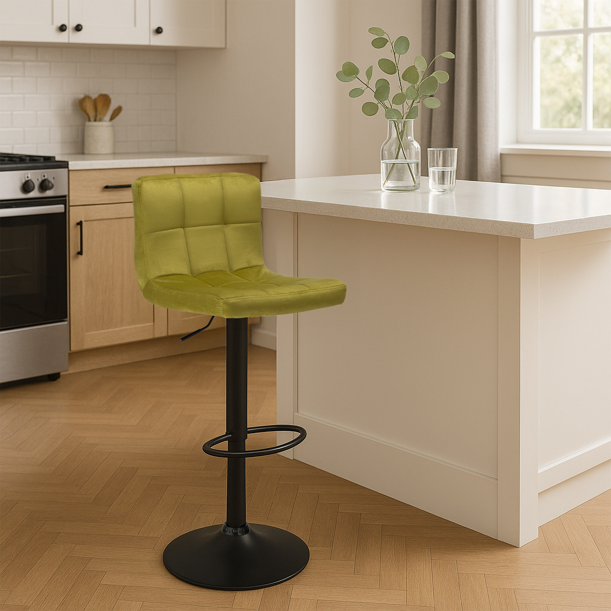 Hoker Arako posiada specjalnie profilowane oparcie, regulowaną wysokość i wygodny podnóżek. Cechuje go także stabilna, antypoślizgowa podstawa, dzięki czemu użytkowanie jest znacznie bezpieczniejsze. Prezentowany poniżej model odznacza się aksamitnym welurowym obiciem i modną, stabilną podstawą w kolorze czarnego matu. Ciekawe, geometryczne przeszycia tworzą przyciągający uwagę wzór kraty, obok której nikt nie przejdzie obojętnie. To wszystko sprawia, że model świetnie pasuje do nowocześnie urządzonych wnętrz.