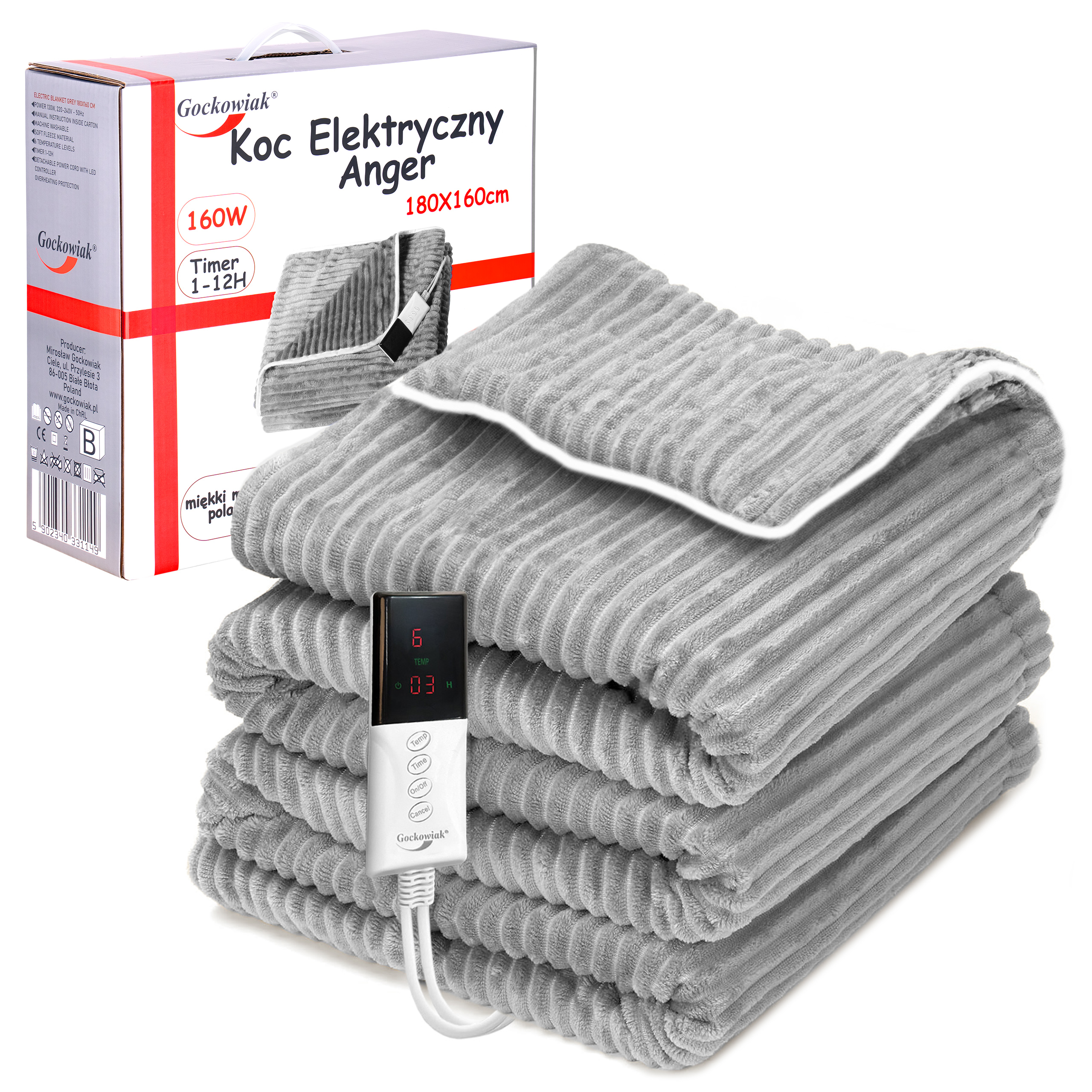 Koc elektryczny 160×180 cm ANGER szary