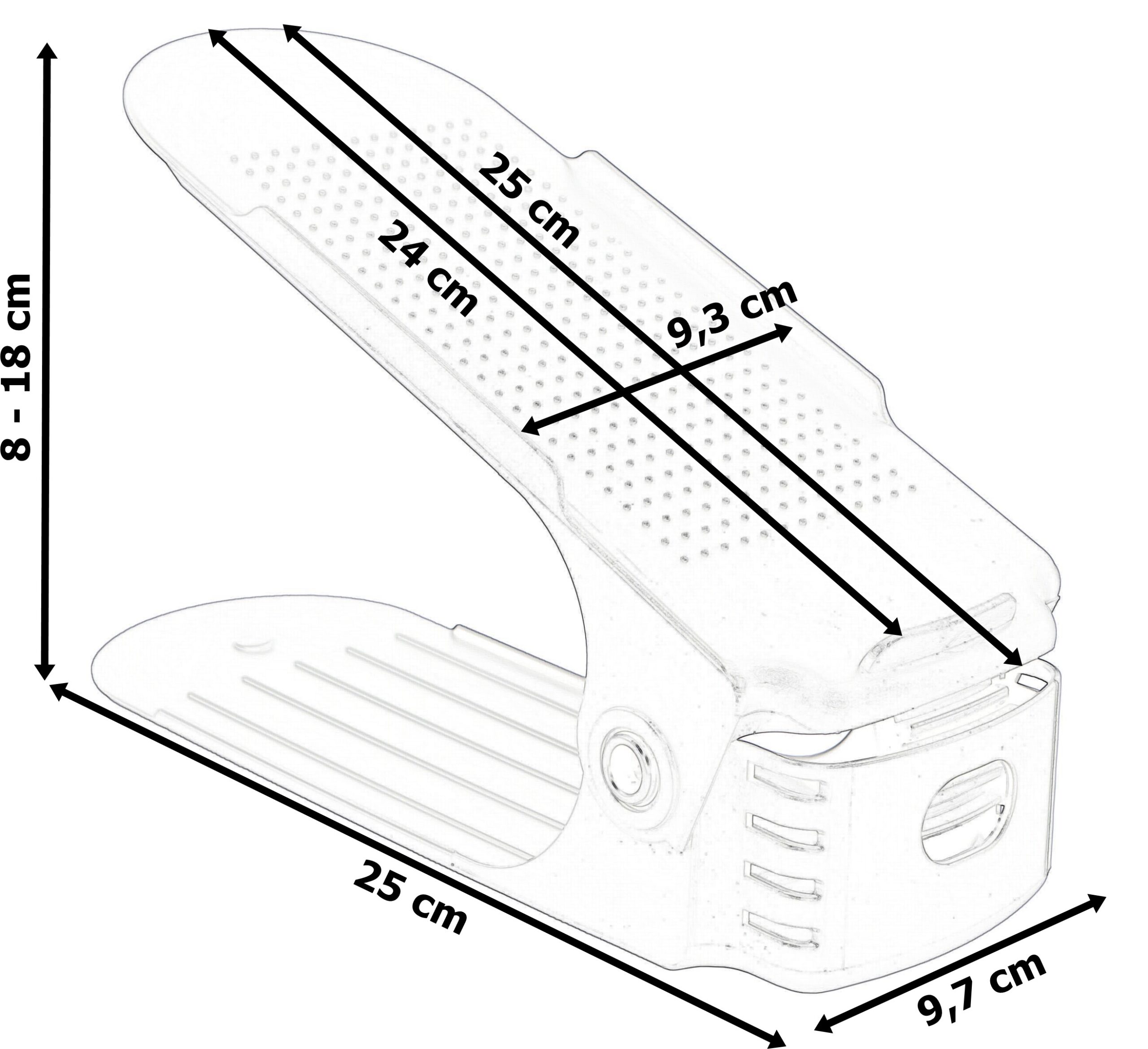 Uchwyt pasuje do wszystkich rodzajów obuwia – adidasów, szpilek itd. Zajmując niewiele miejsca, znacznie zwiększa przestrzeń do przechowywania, dzięki układaniu butów jeden na drugi. Świetnie nadaje się do organizowania obuwia całej rodziny.