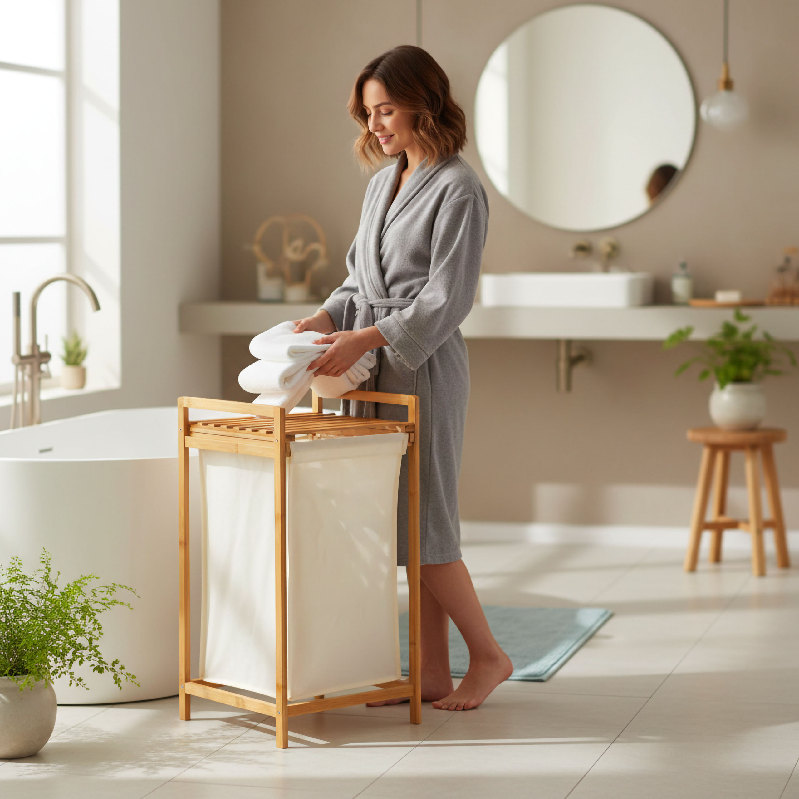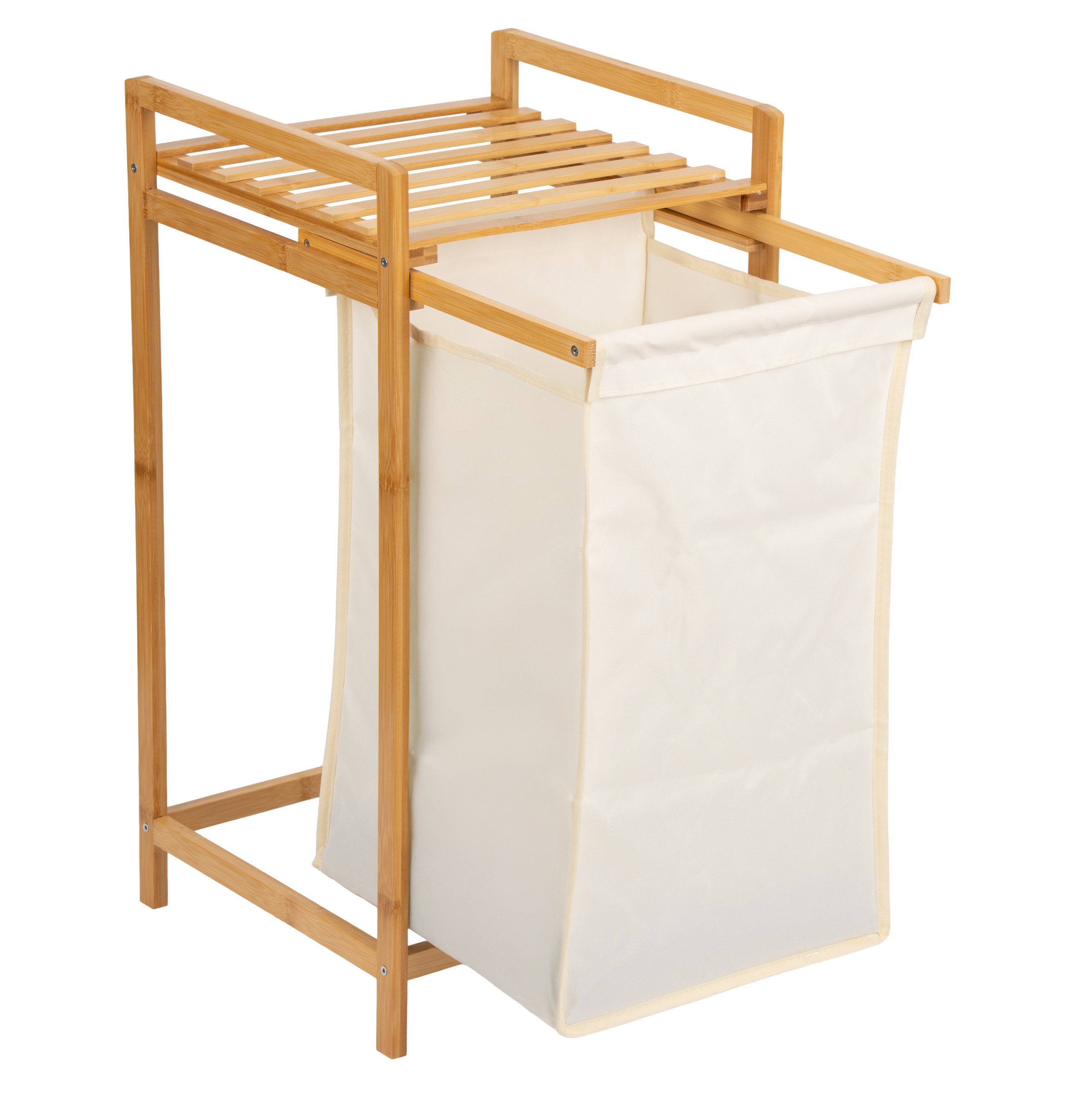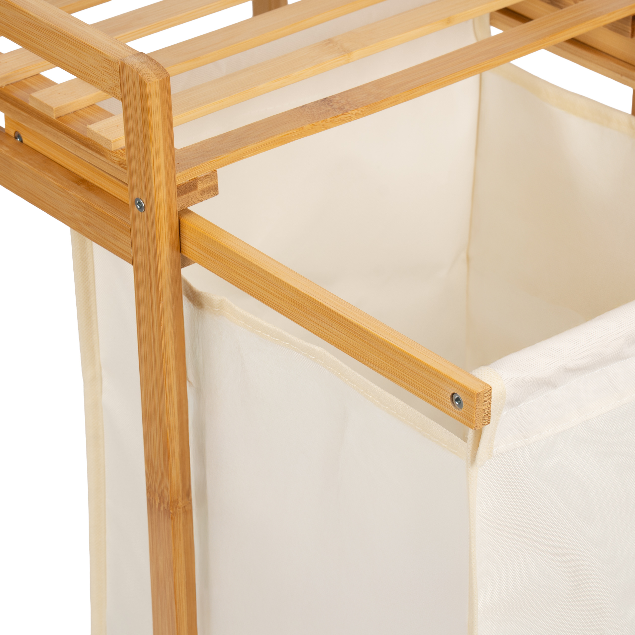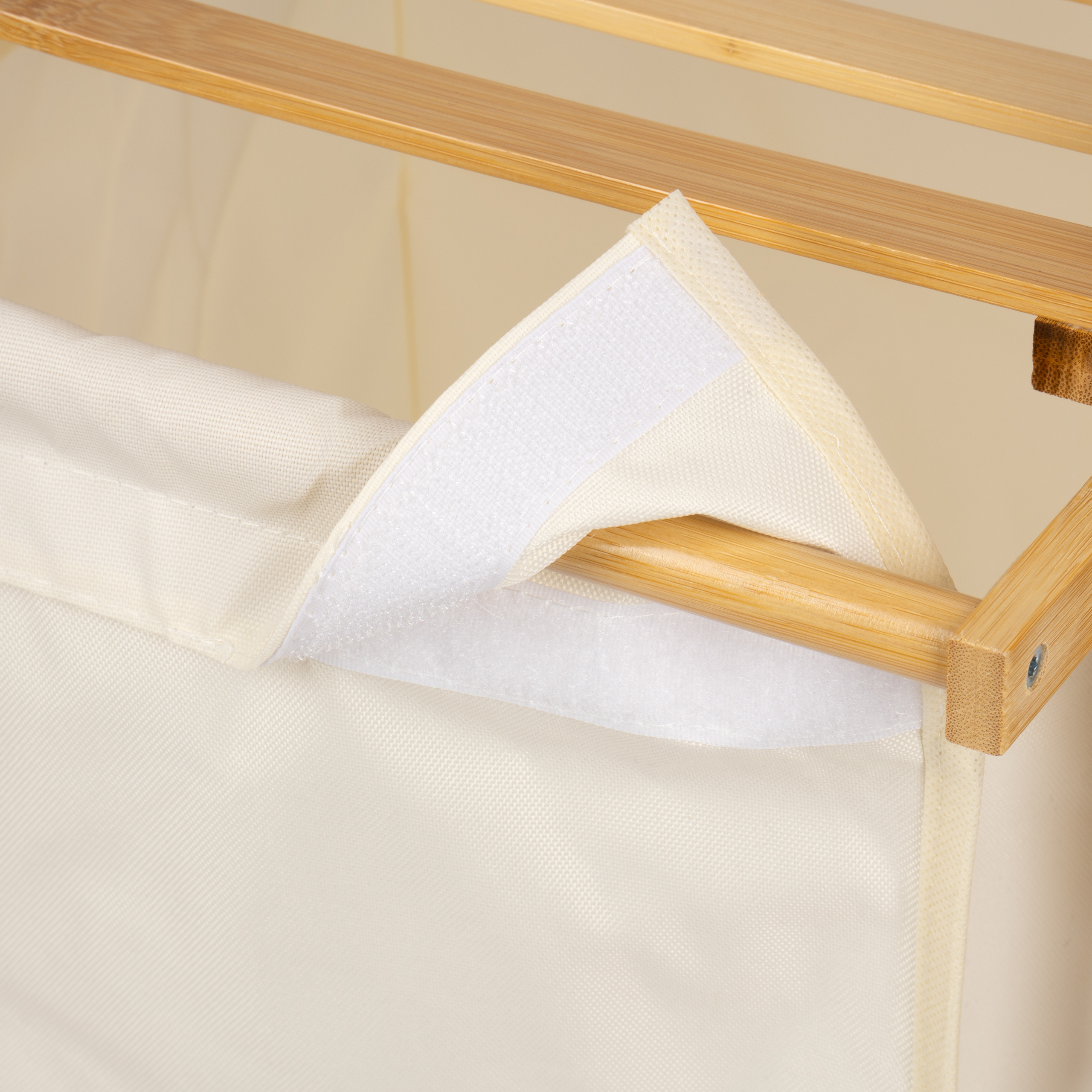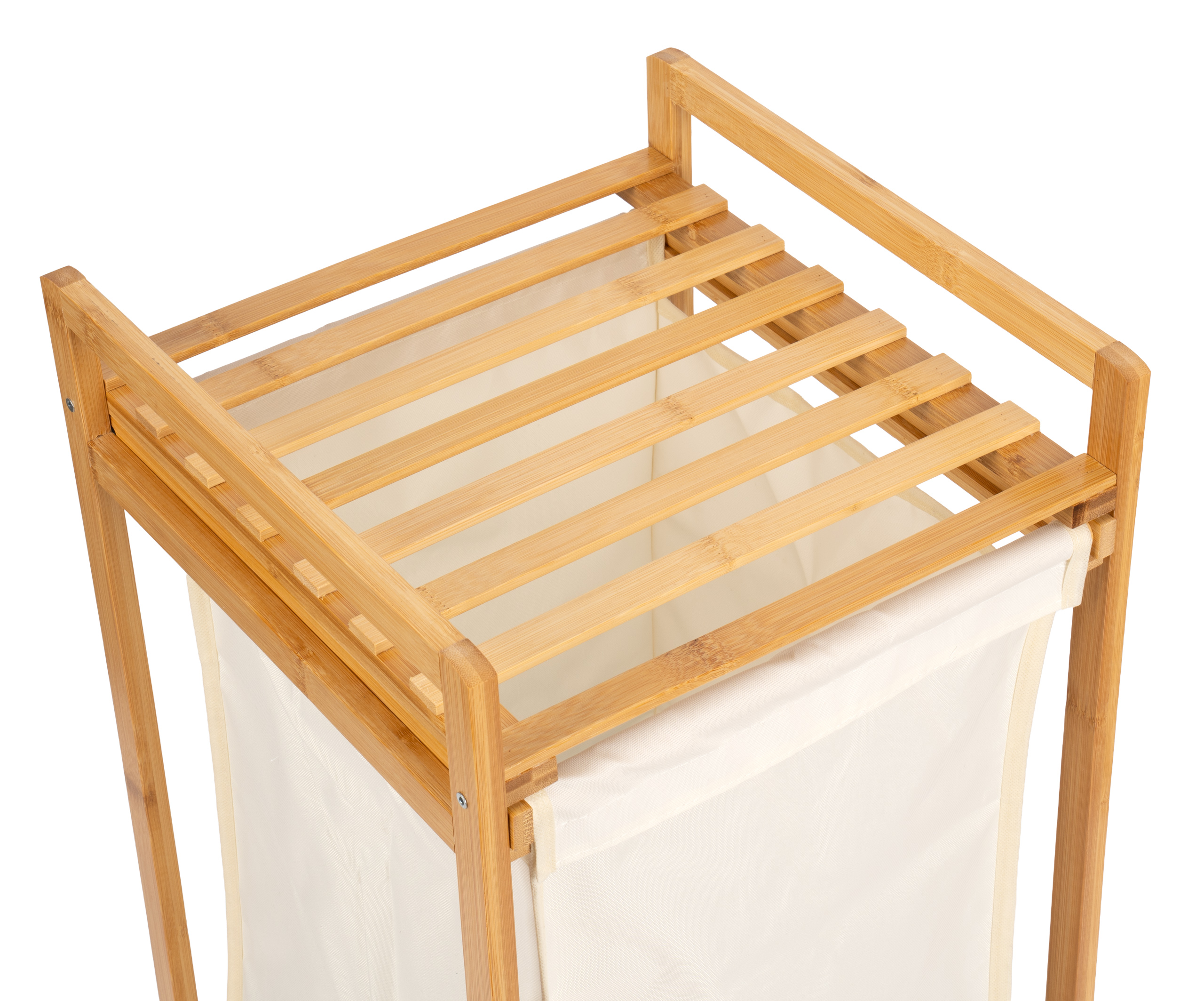 Bambusowy kosz na pranie Hanoi to estetyczny i pojemny kosz, który pomieści mnóstwo odzieży. Wykonany ze szlifowanego bambusa, nie ma ostrych krawędzi, jest przyjemnie gładki i starannie wykończony. Górna półka może służyć jako miejsce na akcesoria łazienkowe, środki piorące, a także jako miejsce na dekoracje czy świece zapachowe. Kosz posiada szyny, które ułatwiają napełnianie i opróżnianie materiałowego worka. Dzięki nim cały worek można wysunąć i przetransportować. Materiał przypięty jest na rzep, można go zdjąć i wyprać. Hanoi złożysz bez wiercenia i specjalistycznych narzędzi. Montaż zajmuje dosłownie chwilę, a wszystko co niezbędne do jego złożenia znajdziesz w zestawie.