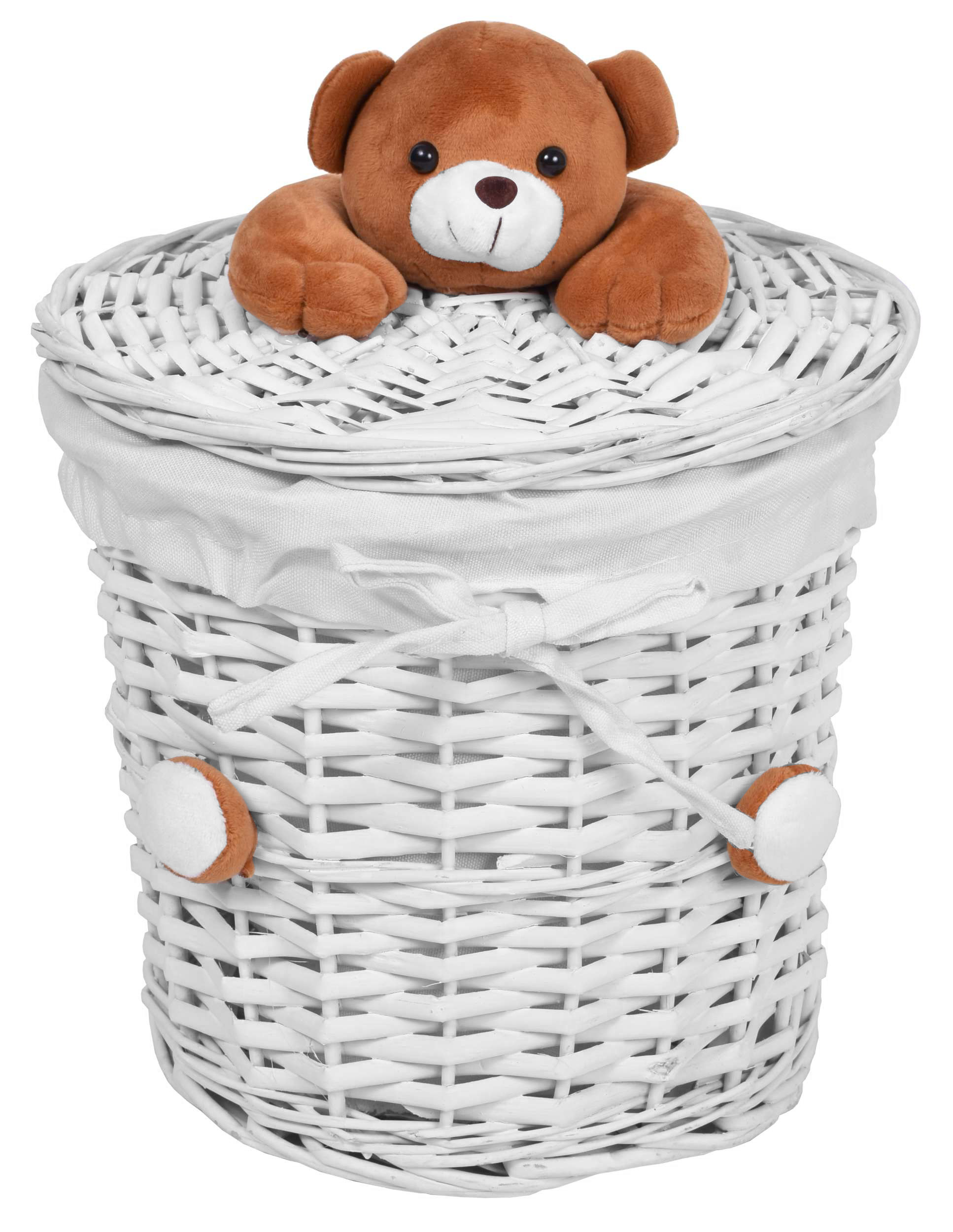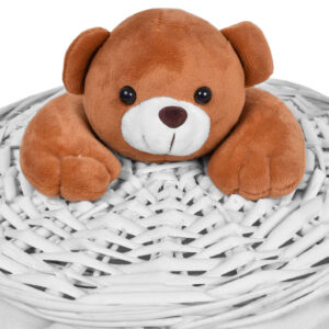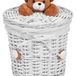 Produkt wykonany z wikliny równym splotem, w środku wyścielony wytrzymałym, kremowym, lnianym materiałem. Pokrywa posiada na górze przyjemnego w dotyku, pluszowego misia.
