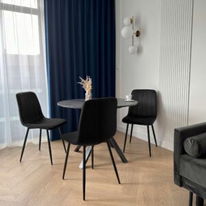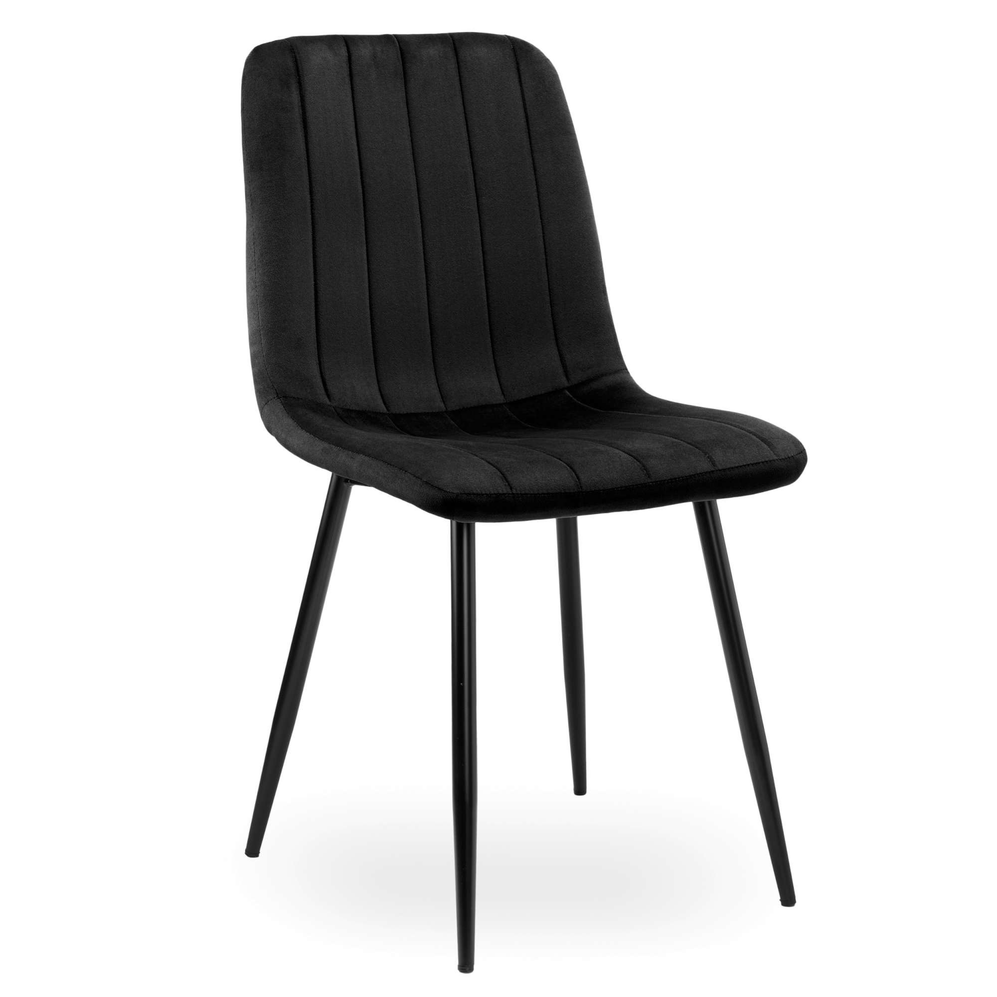 Krzesło Fresno czarne to wyjątkowe krzesło zaprojektowane w stylu skandynawskim. Tapicerowane miękką aksamitną tkaniną z delikatnymi przeszyciami tworzącymi przyciągający wzrok wzór. Niezwykle wygodne o ergonomicznym kształcie. Nogi w kolorze czarnego matu