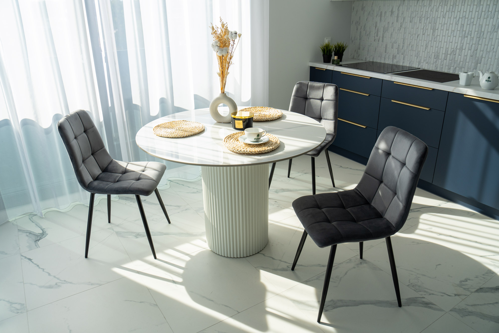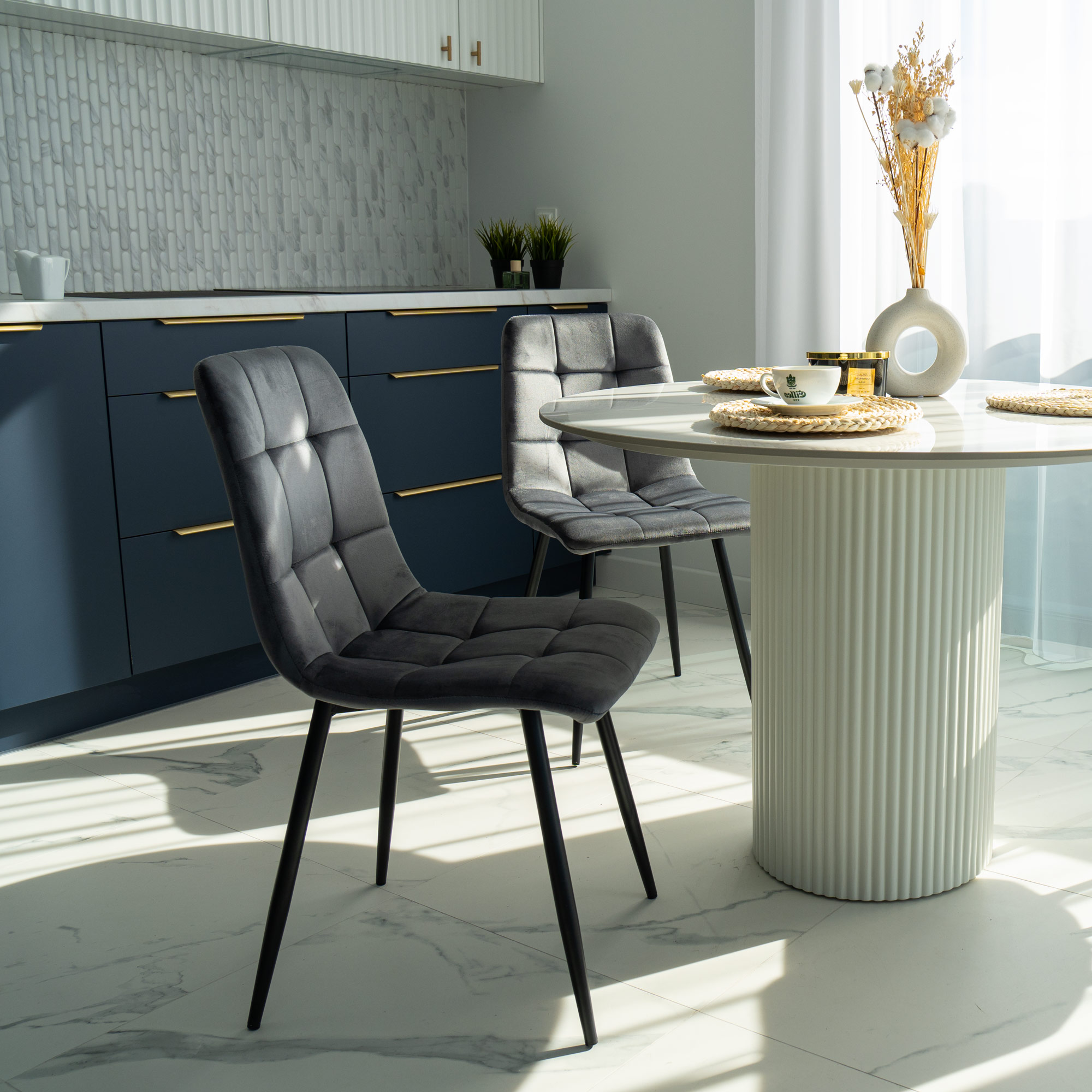 Krzesło Denver to wyjątkowe krzesło zaprojektowane w stylu skandynawskim. Tapicerowane miękką aksamitną tkaniną z delikatnymi przeszyciami tworzącymi przyciągający wzrok wzór. Niezwykle wygodne o ergonomicznym kształcie. Nogi w kolorze czarnego matu