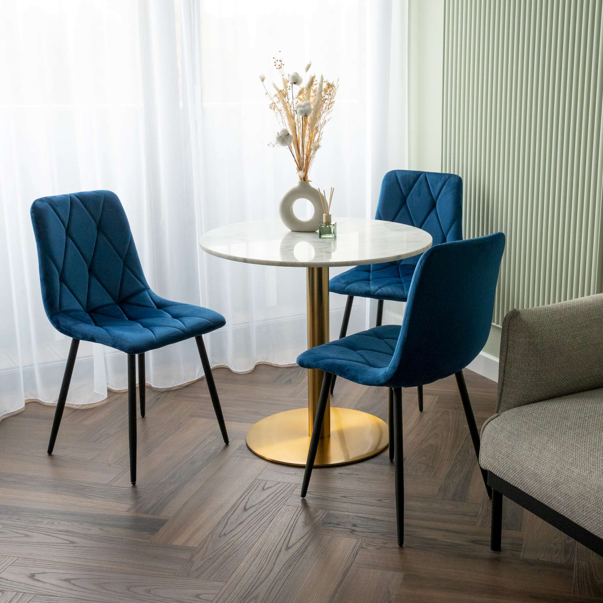 Krzesło Madison to wyjątkowe krzesło zaprojektowane pod kątem stylu glamour oraz loft. Tapicerowane miękką aksamitną tkaniną z delikatnymi przeszyciami tworzącymi przyciągający wzrok wzór. Niezwykle wygodne o ergonomicznym kształcie. Nogi w kolorze czarnego matu