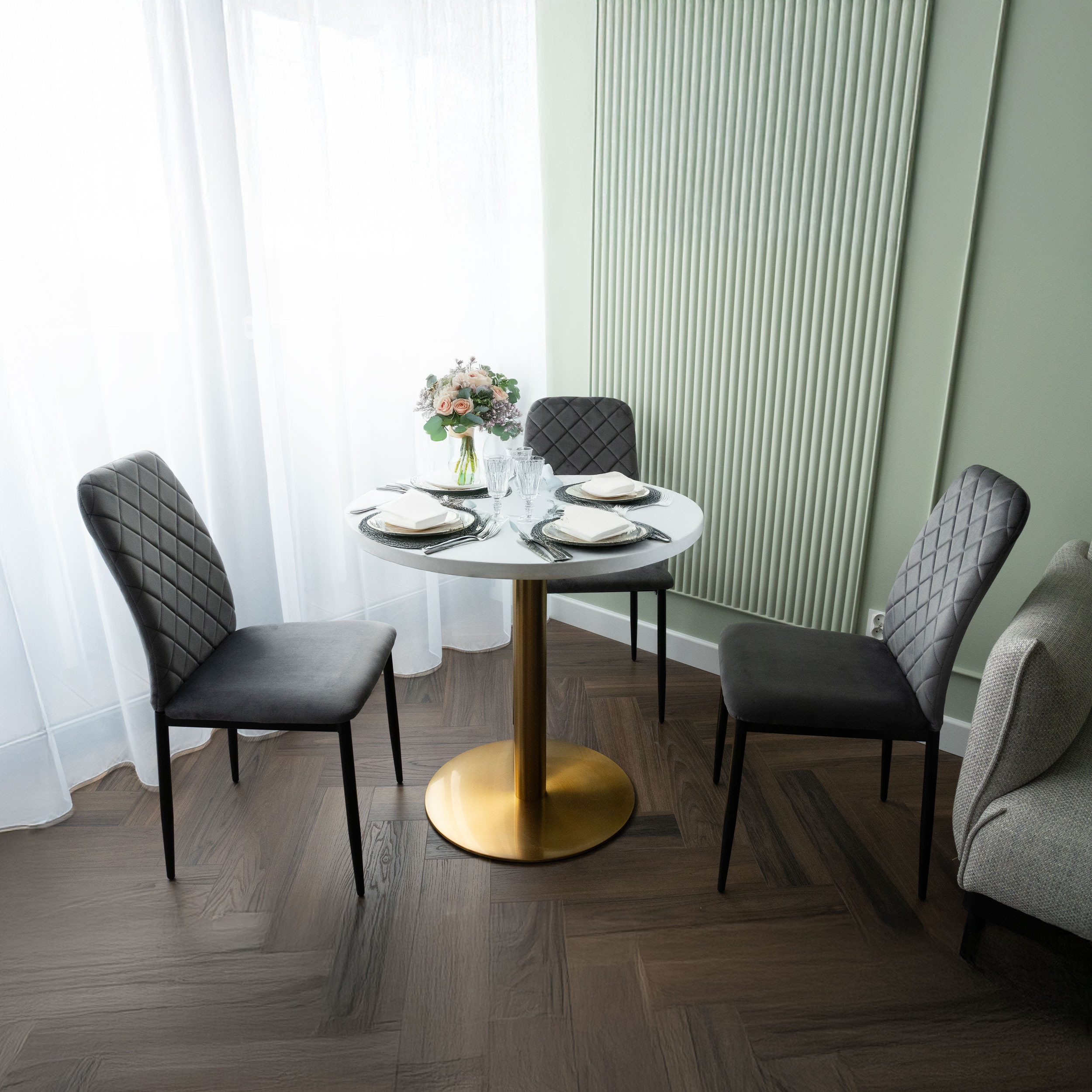 Nogi w kolorze czarnego matu idealnie dopełnią stylizację wnętrza. Model idealnie sprawdzi się w nowoczesnych pomieszczeniach dodając im blasku i świeżości. Atrakcyjny design i wzór sprawia, że krzesło doskonale sprawdzi się w jadalni, salonie czy garderobie.