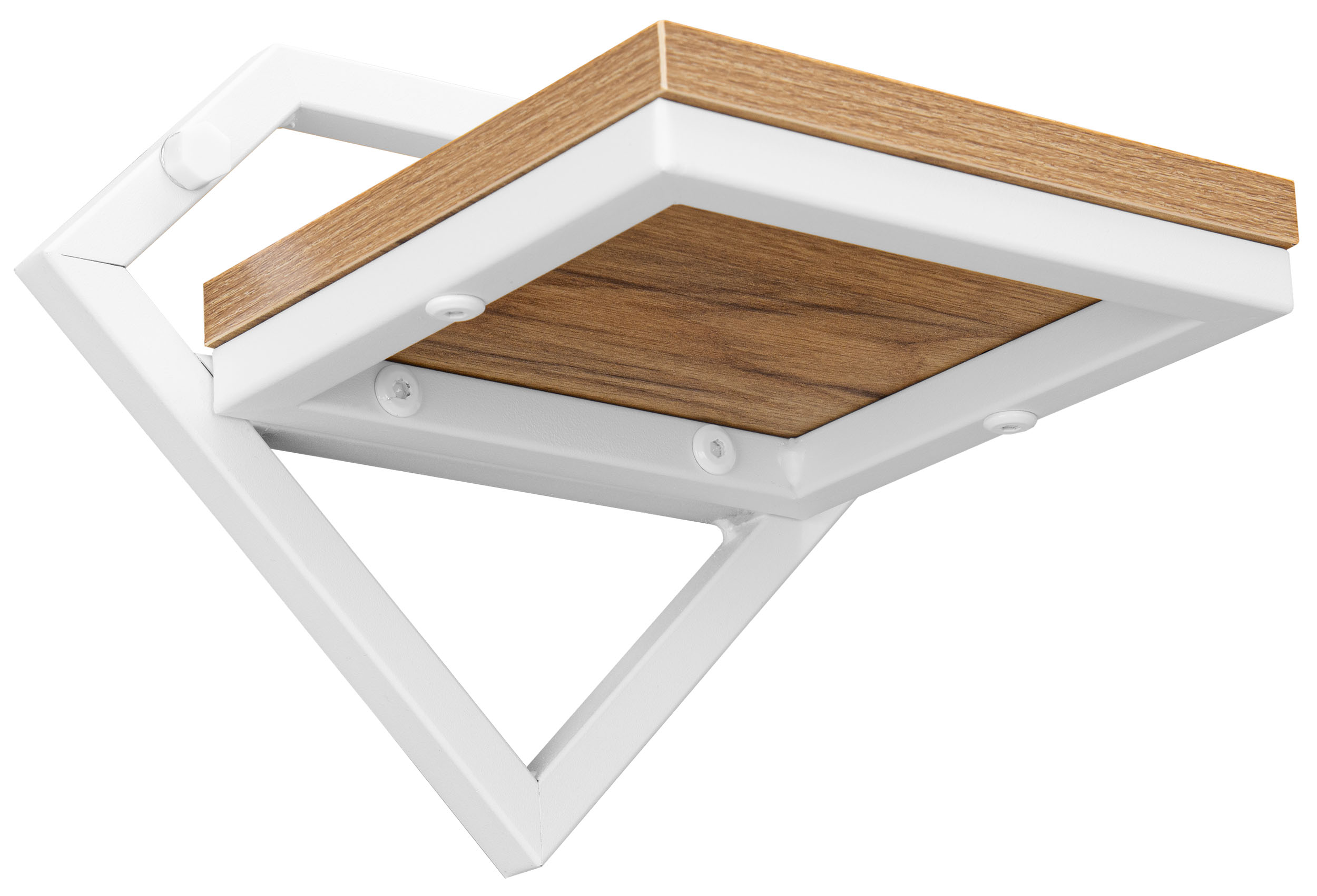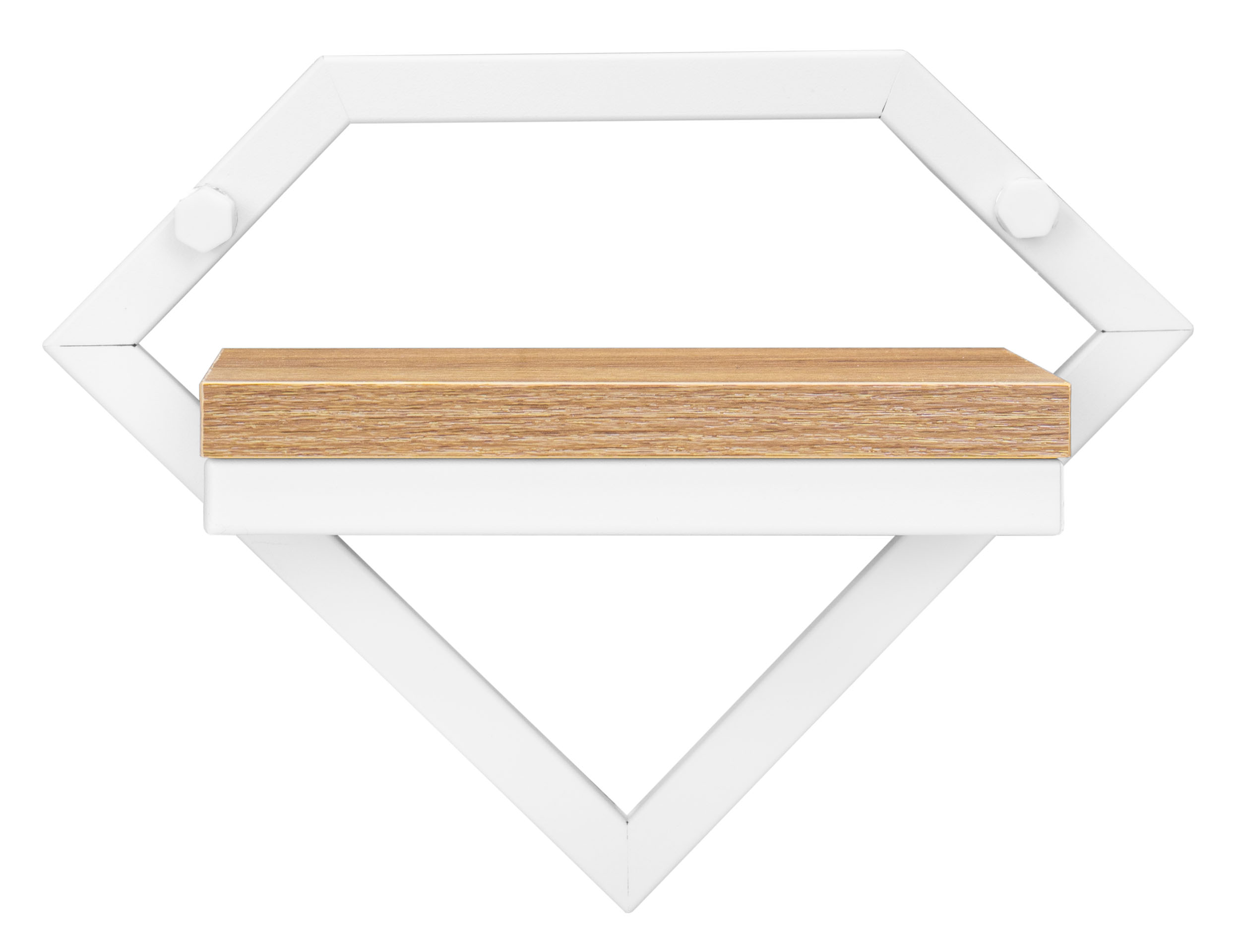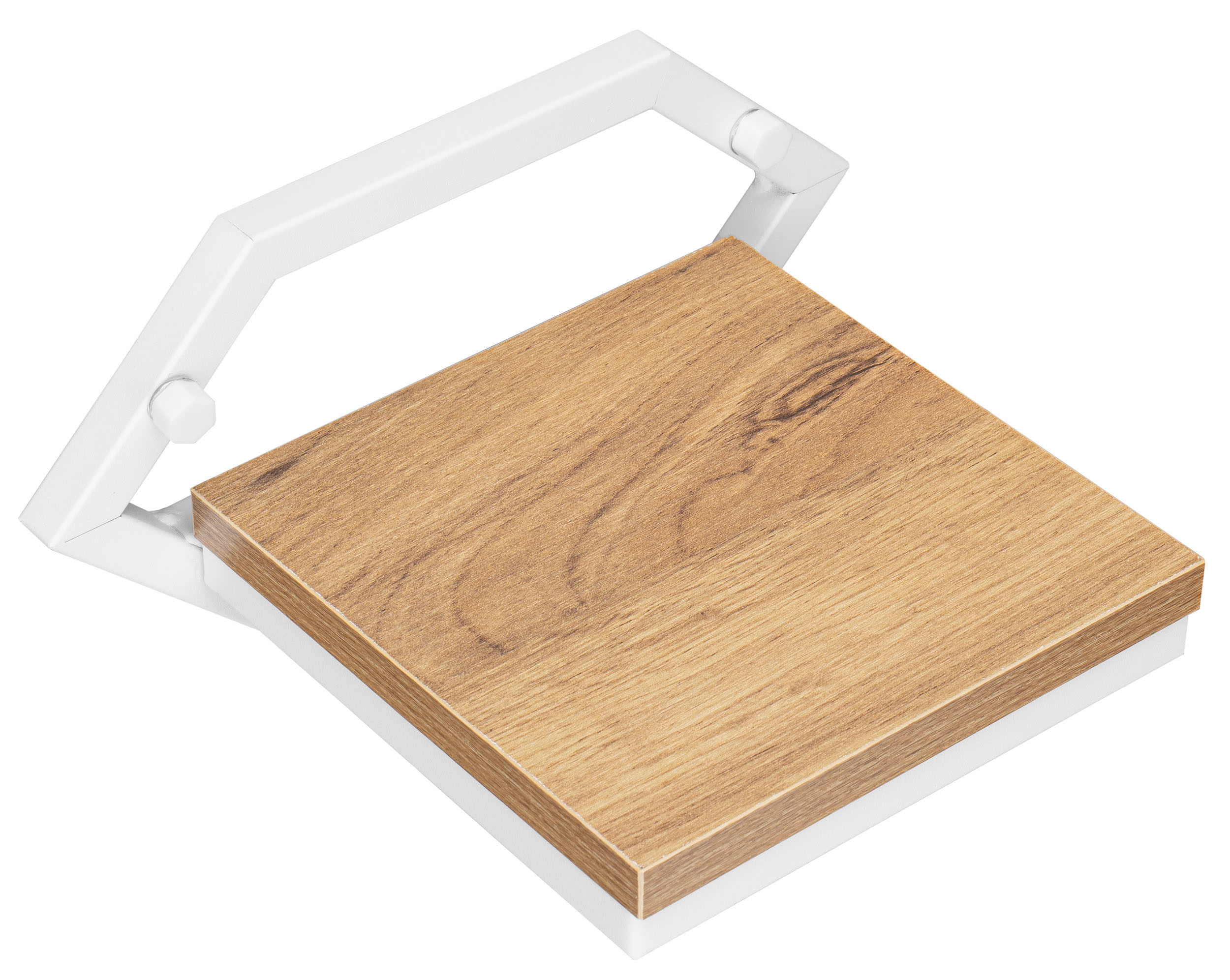 Półka z płyty laminowanej w kolorze dąb craft dodaje naturalnego akcentu, który świetnie kontrastuje z białą, metalową konstrukcją.