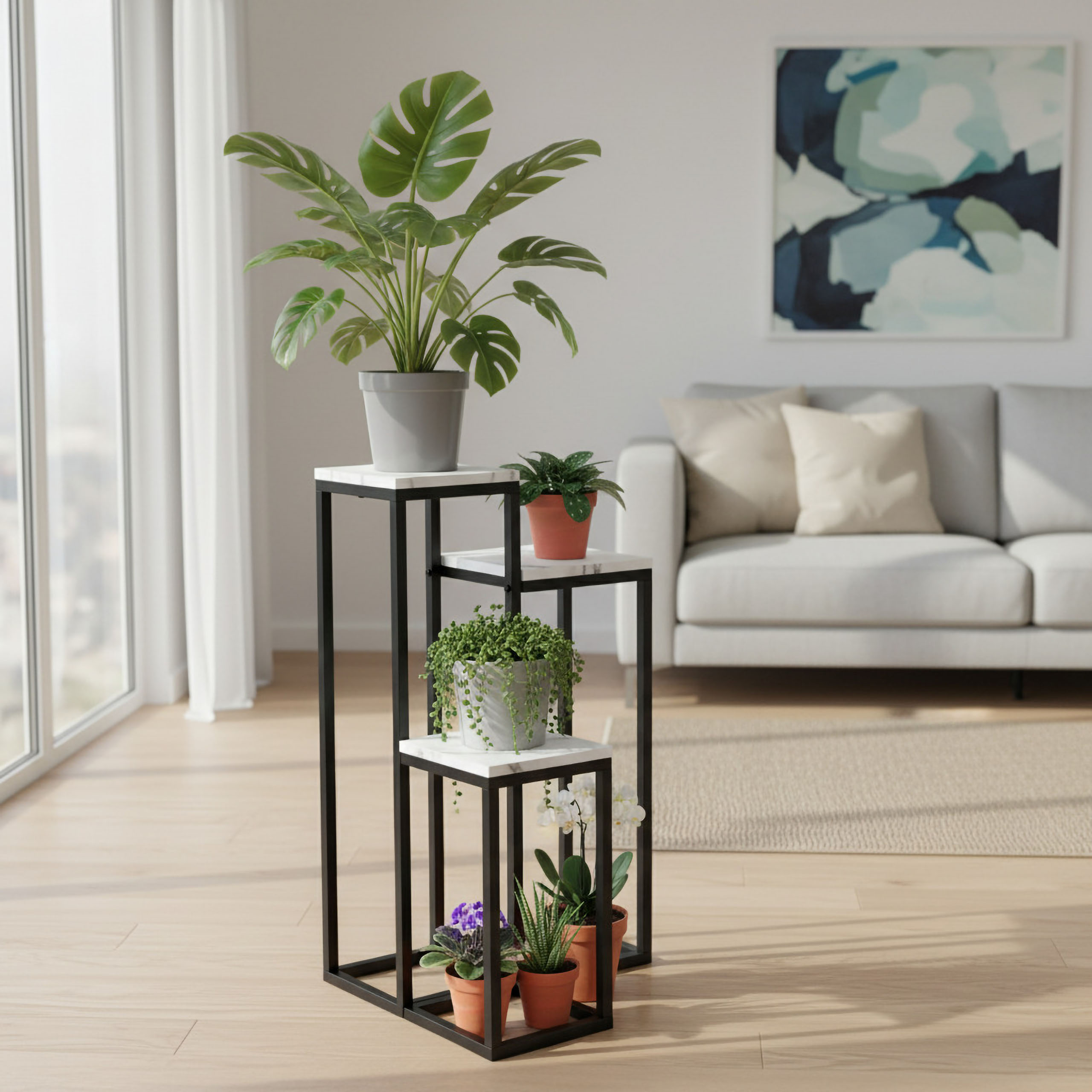 Kwietnik Munir Biały Marmur to elegancki i funkcjonalny dodatek, który odmieni Twoje wnętrze. Dzięki trzem poziomom zyskujesz więcej miejsca na rośliny, dekoracje i dodatki, a jednocześnie porządek i estetykę w domu. Minimalistyczny design z efektem białego marmuru i stabilną, metalową podstawą w kolorze czarnym sprawia, że kwietnik idealnie pasuje do nowoczesnych, loftowych i klasycznych aranżacji.