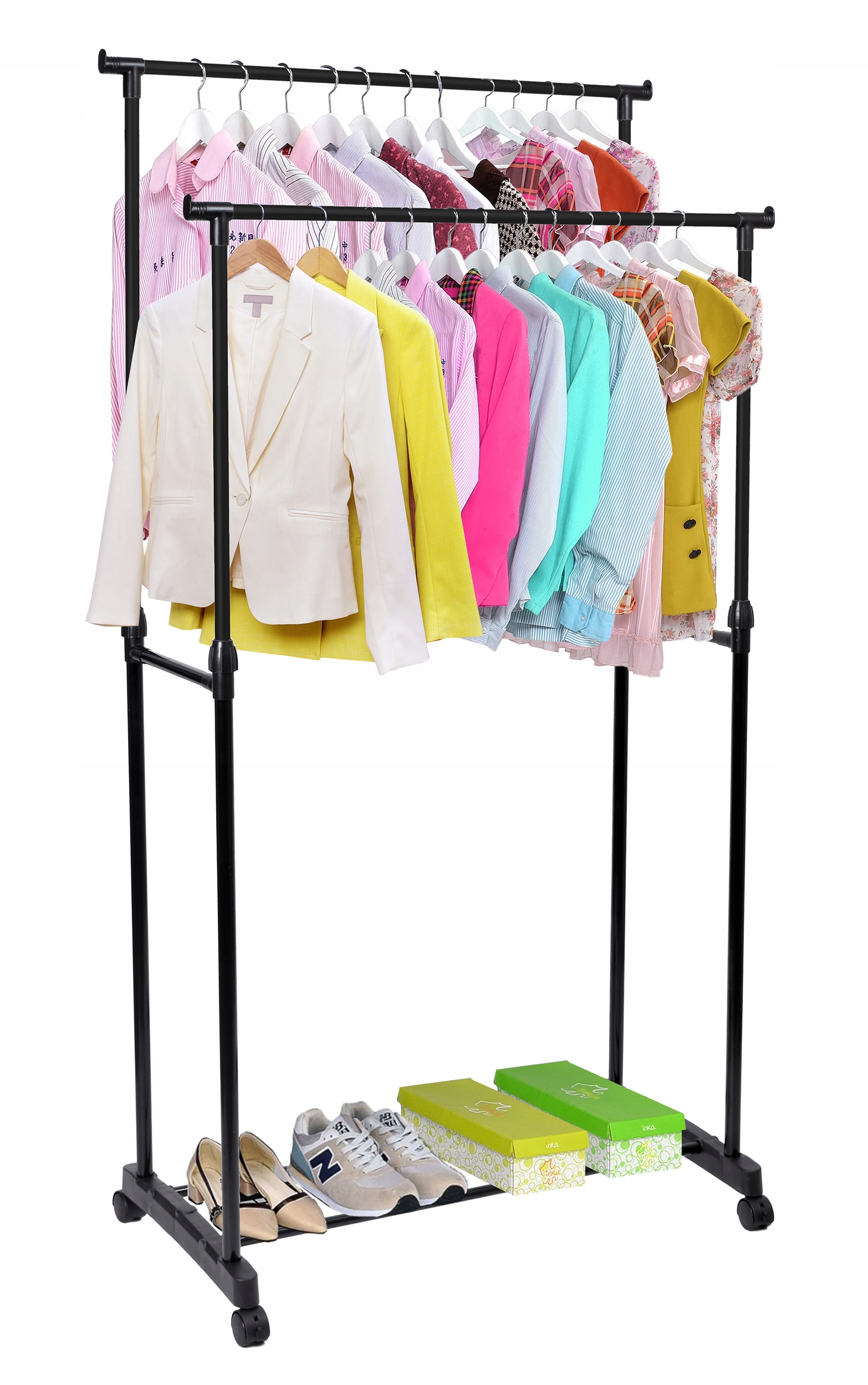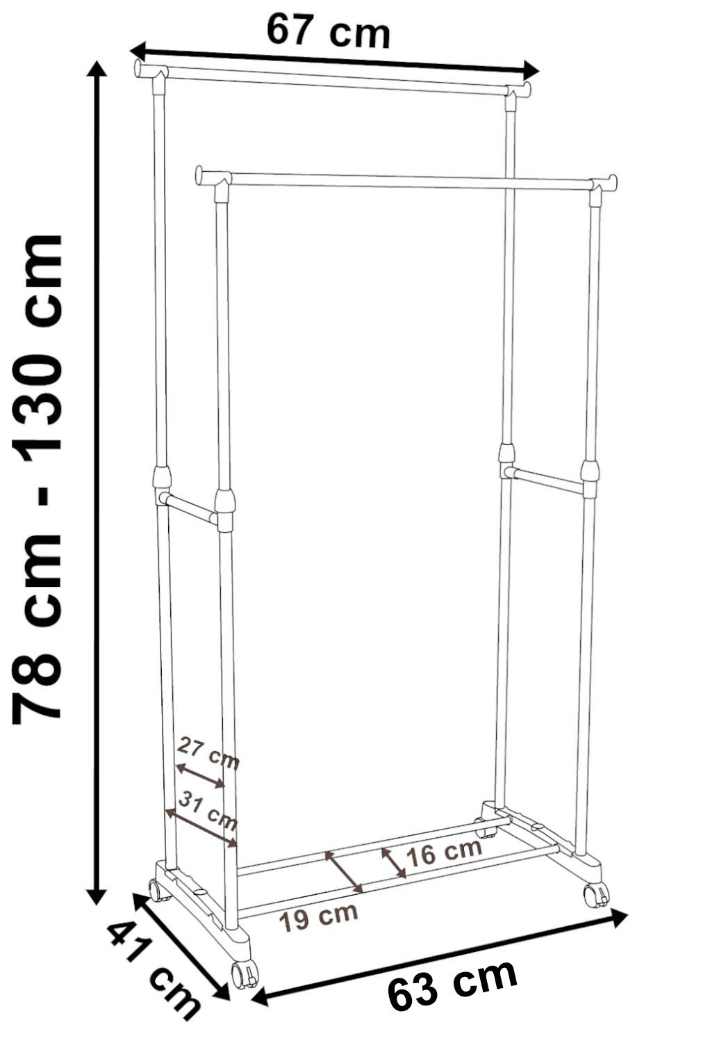Praktyczny i wytrzymały wieszak garderobiany na kółkach. Wieszak AMA sprawdzi się w każdym domu i w biurze, w którym brakuje miejsca do powieszenia odzieży. Nasz produkt został wyposażony w dwa wytrzymałe drążki, który pomieści naprawdę dużo odzieży. Dodatkowym atutem wieszaka są nakładki na końce drążka, uniemożliwiające zsunięcie się wieszaków z odzieżą. Montaż wieszaka jest niezwykle prosty i nie wymaga użycia narzędzi. Czarny kolor wieszaka sprawi, że doskonale wpisze się w każdy styl wnętrza, w szczególności glamour i loft.