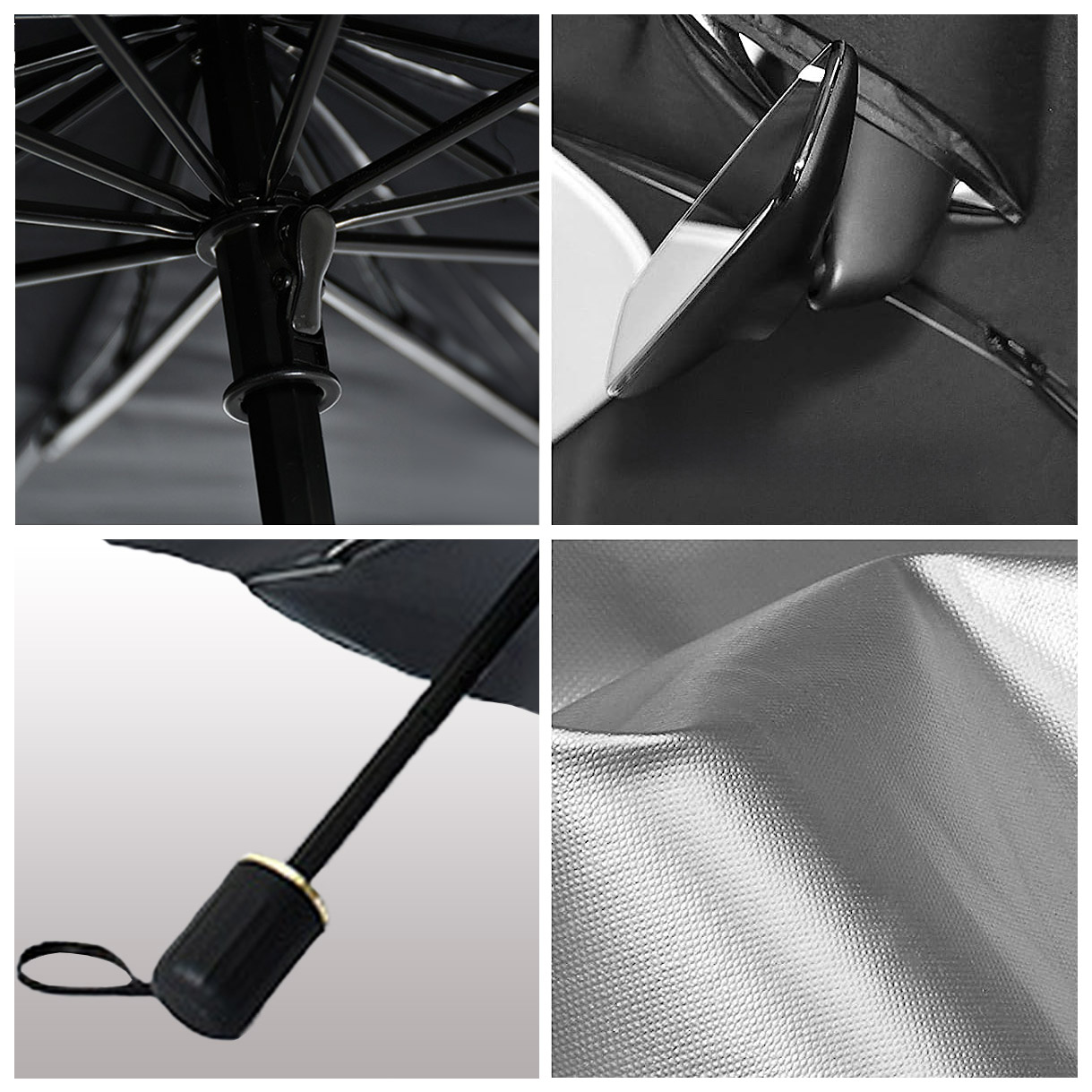 Srebrna strona parasola została pokryta powłoką z domieszką tytanu, dzięki czemu doskonale odbija światło słoneczne i promienie UV, utrzymując znacznie niższą temperaturę w aucie.