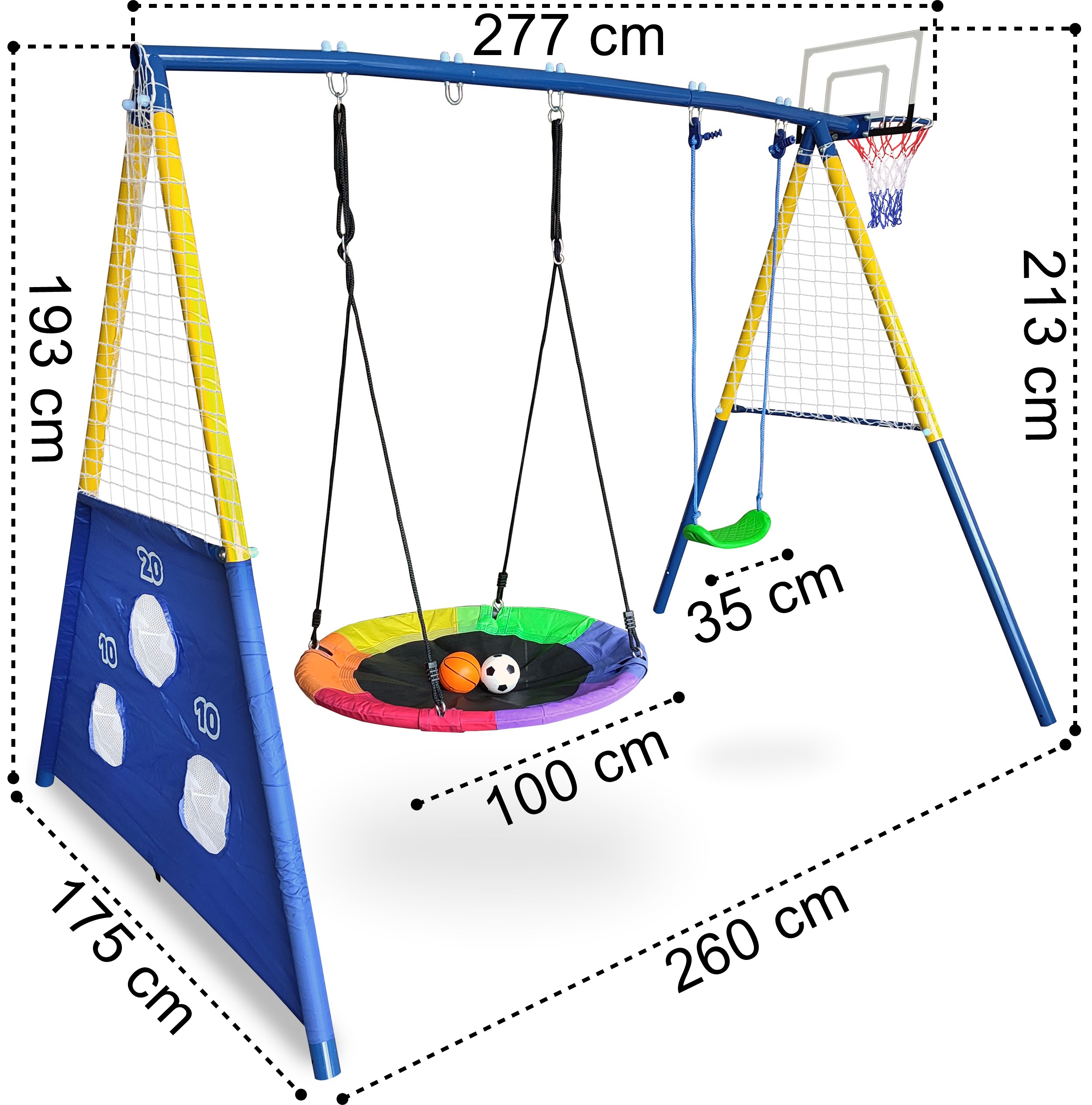 W zestawie: huśtawka pojedyncza, huśtawka bocianie gniazdo, kosz do koszykówki z piłką, mata celnościową z piłką do piłki nożnej, pompka, kompletny zestaw montażowy, siatki zabezpieczające, szpilki mocujące, czytelna instrukcja w języku polskim.