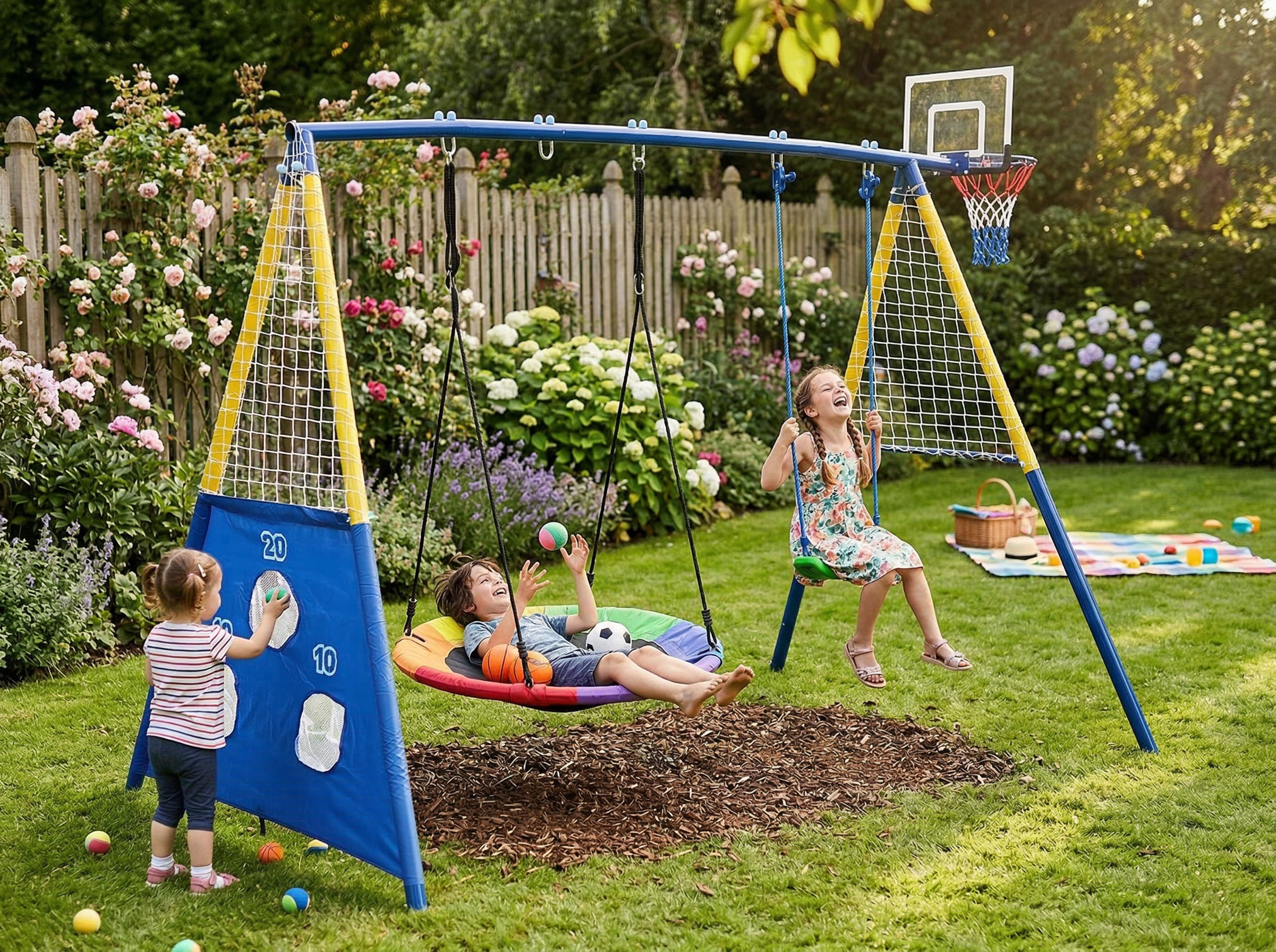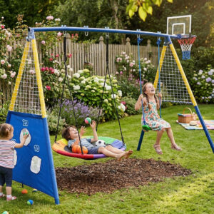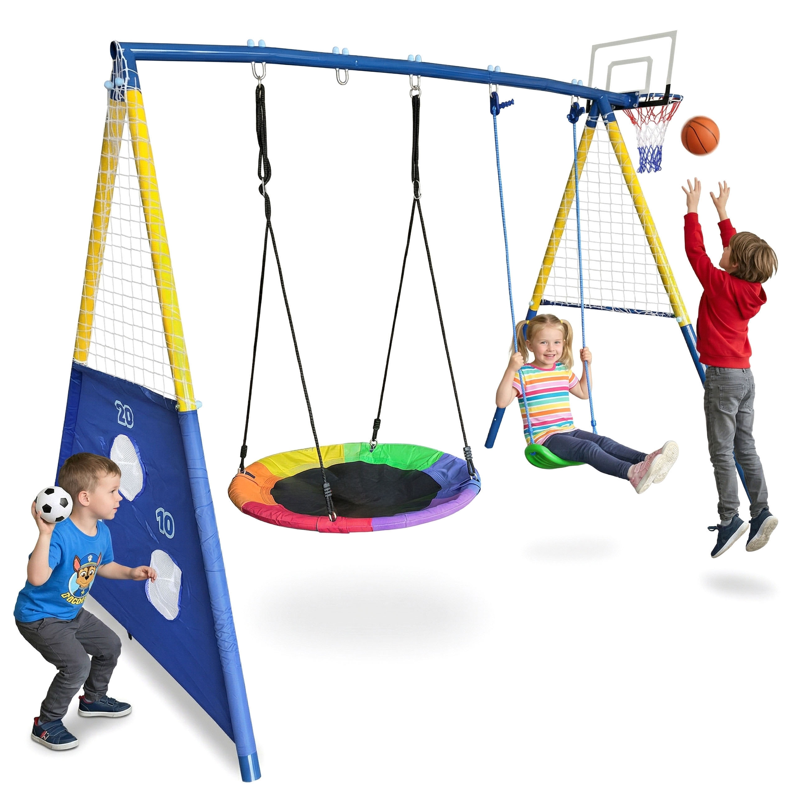 Przeznaczenie: do ogrodu jako plac zabaw | W zestawie: 2 huśtawki, mata celownicza i piłki, siatka, kosz do gry wraz z tablicą