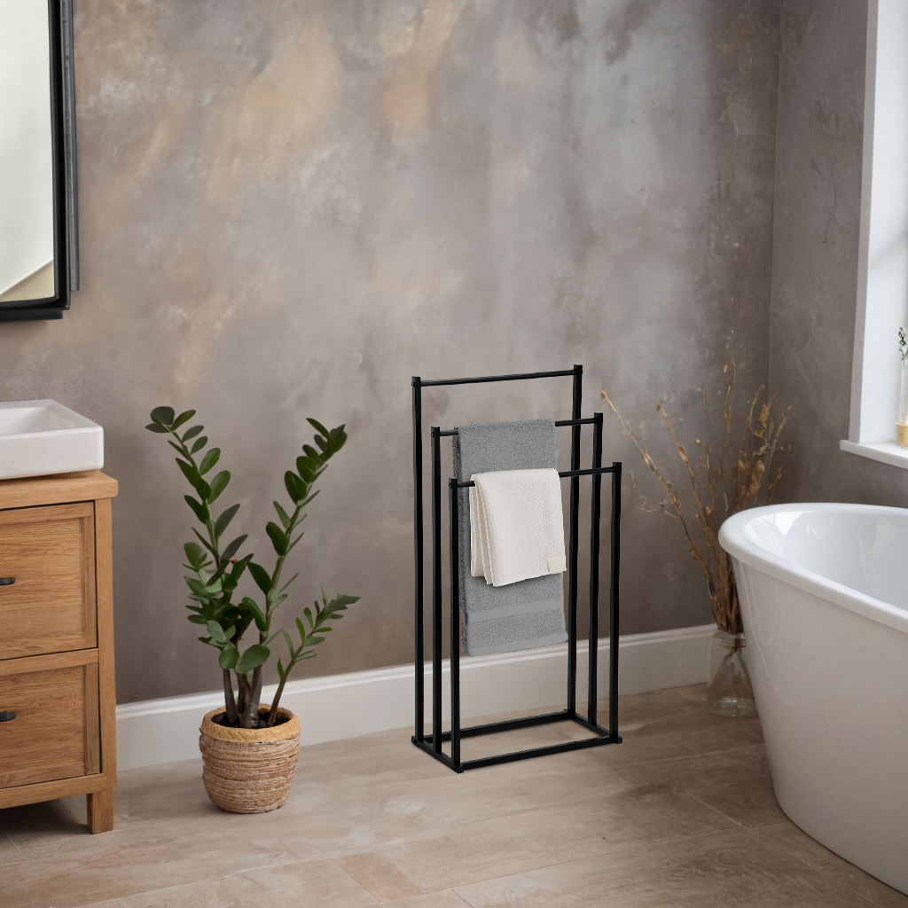 Stojak na ręczniki Tormes od LoftInspired to stylowe i praktyczne rozwiązanie dla każdej łazienki. Wykonany z trwałej stali malowanej proszkowo na czarny mat, idealnie wpasowuje się w loftowy klimat, nadając wnętrzu nowoczesny i industrialny wygląd. Dzięki trzem ramionom zapewnia sporo miejsca na ręczniki, a wolnostojąca konstrukcja umożliwia łatwe przestawianie i umieszczanie w dowolnym miejscu. Doskonały wybór dla tych, którzy cenią sobie połączenie stylu z funkcjonalnością.