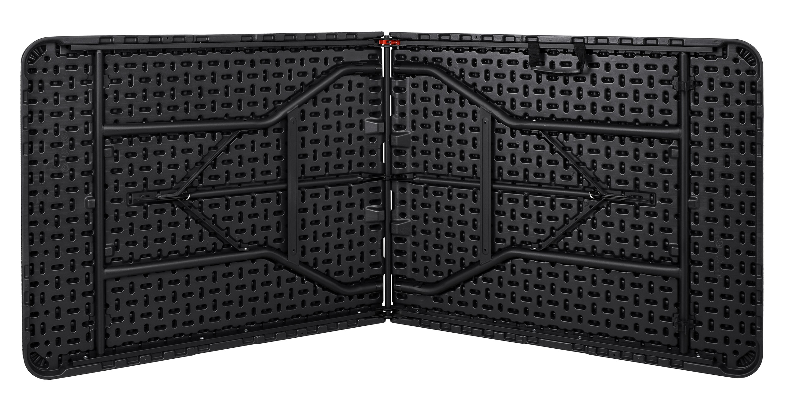 Składany stół cateringowy. Bardzo praktyczny i lekki. Konstrukcja wykonana ze stali malowanej proszkowo. Blat wykonany z polietylenu HDPE. Wzorowany na rattan. Odporny na promienie słoneczne. Dzięki unikalnemu projektowi całość konstrukcji chowa się w blat stołu, zajmując mało miejsca i tworząc ergonomiczną walizkę, łatwą do przenoszenia.