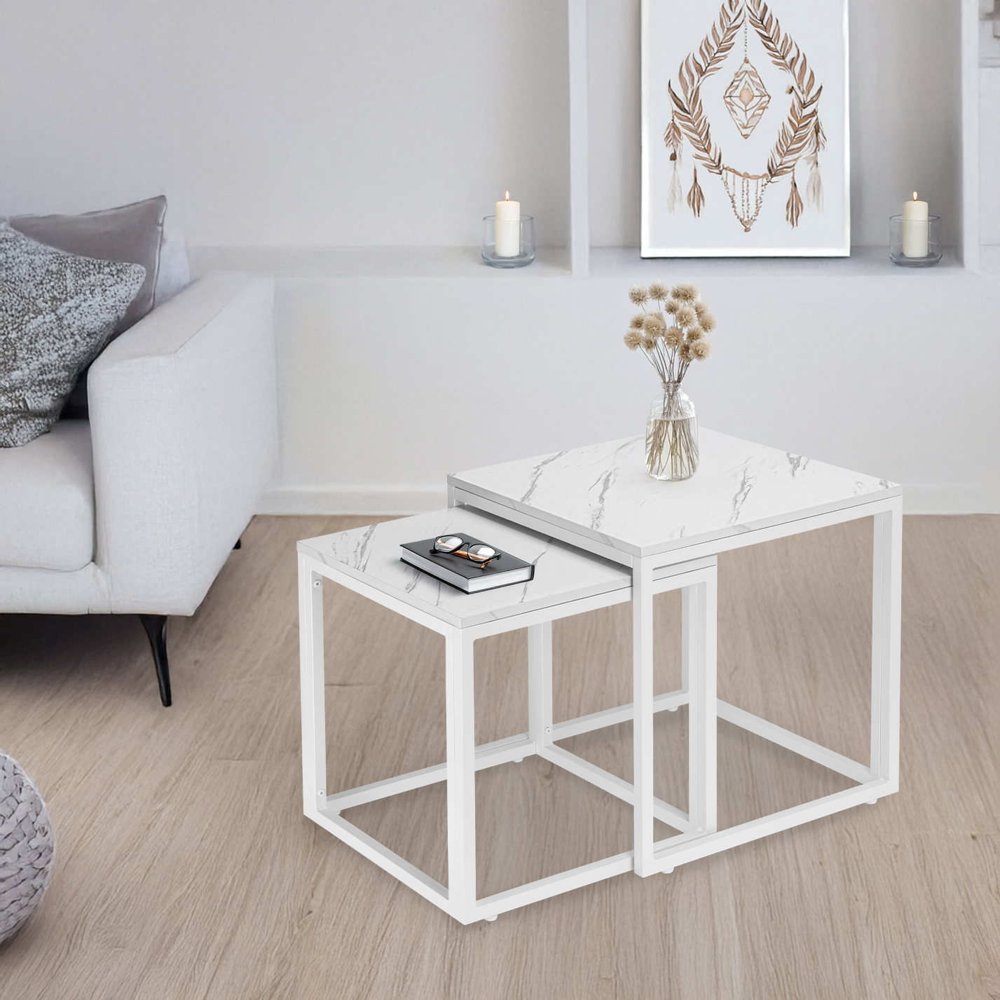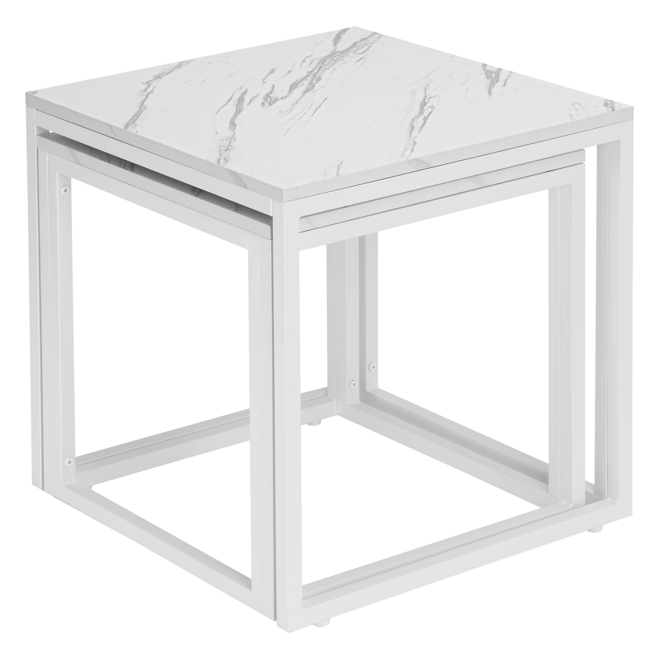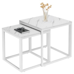 Zestaw stolików Praven to połączenie elegancji i funkcjonalności, które odmieni Twoje wnętrze. Idealnie sprawdzą się w salonie, biurze czy pokoju gościnnym, oferując praktyczne rozwiązanie w stylowym wydaniu. Możesz ustawić je razem, tworząc dynamiczną aranżację, lub osobno – w zależności od potrzeb. Regulowane nóżki zapewniają stabilność nawet na nierównych powierzchniach, a solidna metalowa konstrukcja gwarantuje trwałość na lata. Zastosowanie laminowanego blatu o wyglądzie marmuru sprawia, że stoliki są eleganckie i łatwe w utrzymaniu czystości. Dodatkowym atutem jest możliwość wsunięcia mniejszego stolika pod większy, co pozwala zaoszczędzić miejsce, gdy nie są w użyciu.