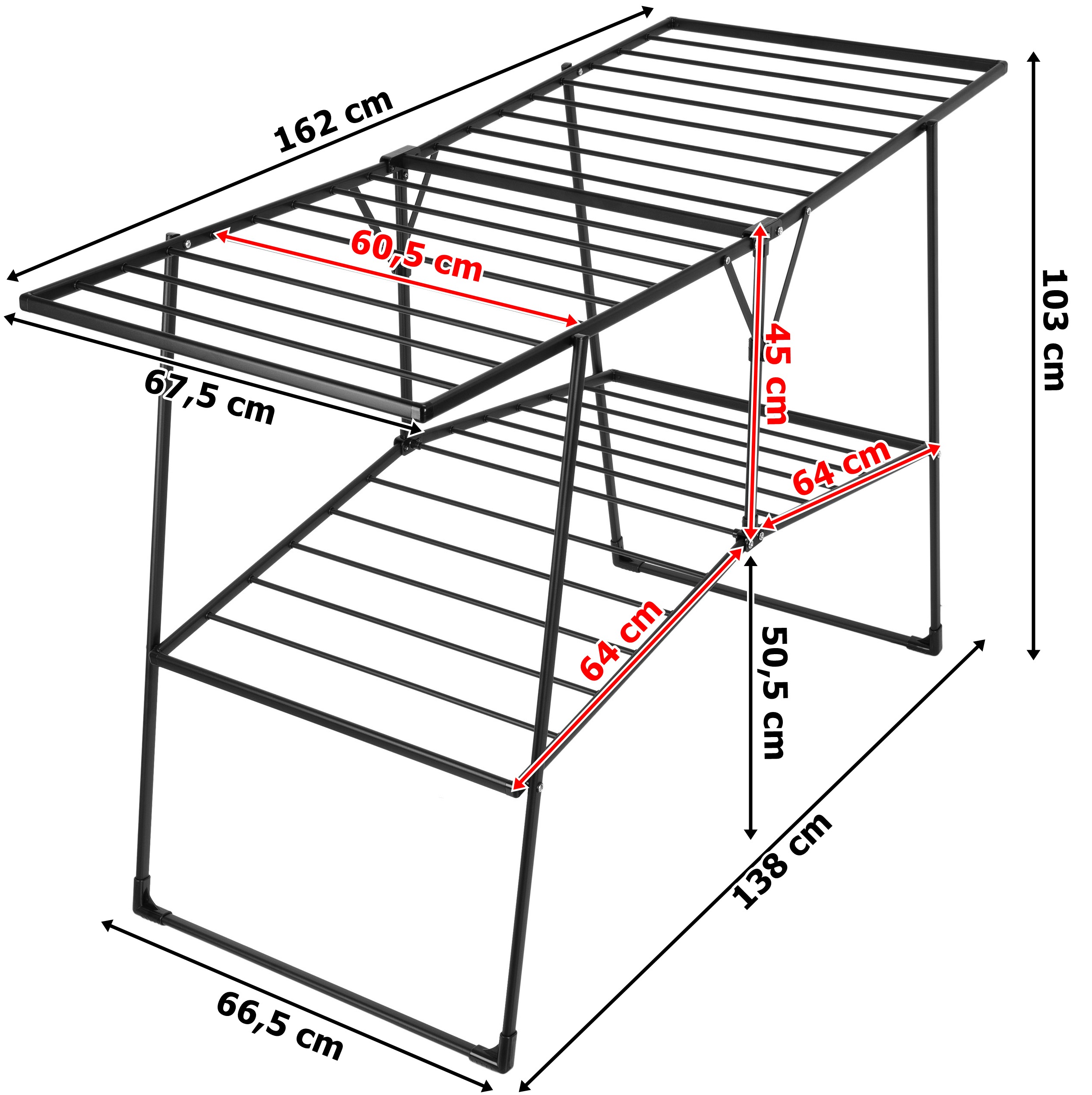 Wymiary suszarki po rozłożeniu to szerokość 162 cm, głębokość 67,5 cm i wysokość 103 cm.