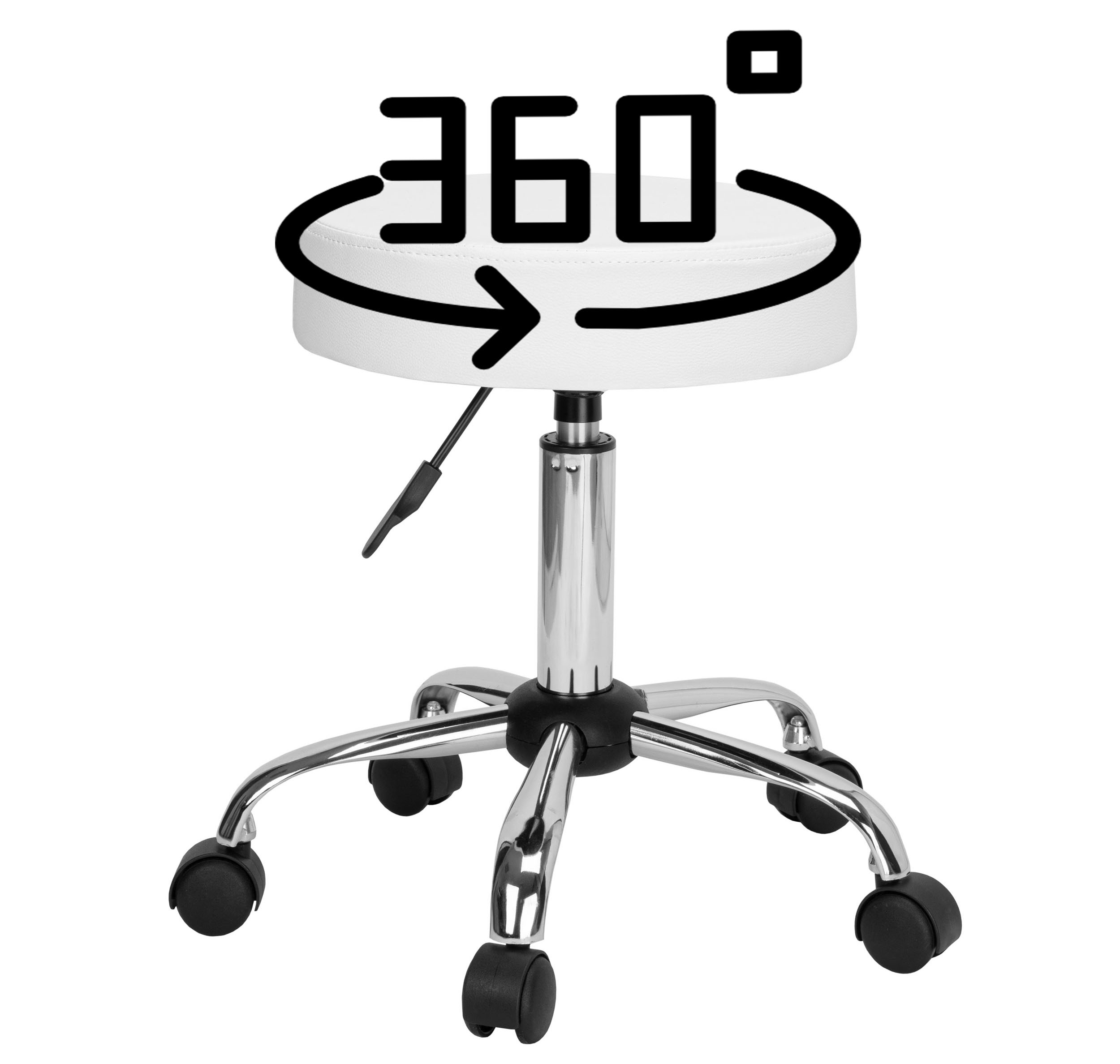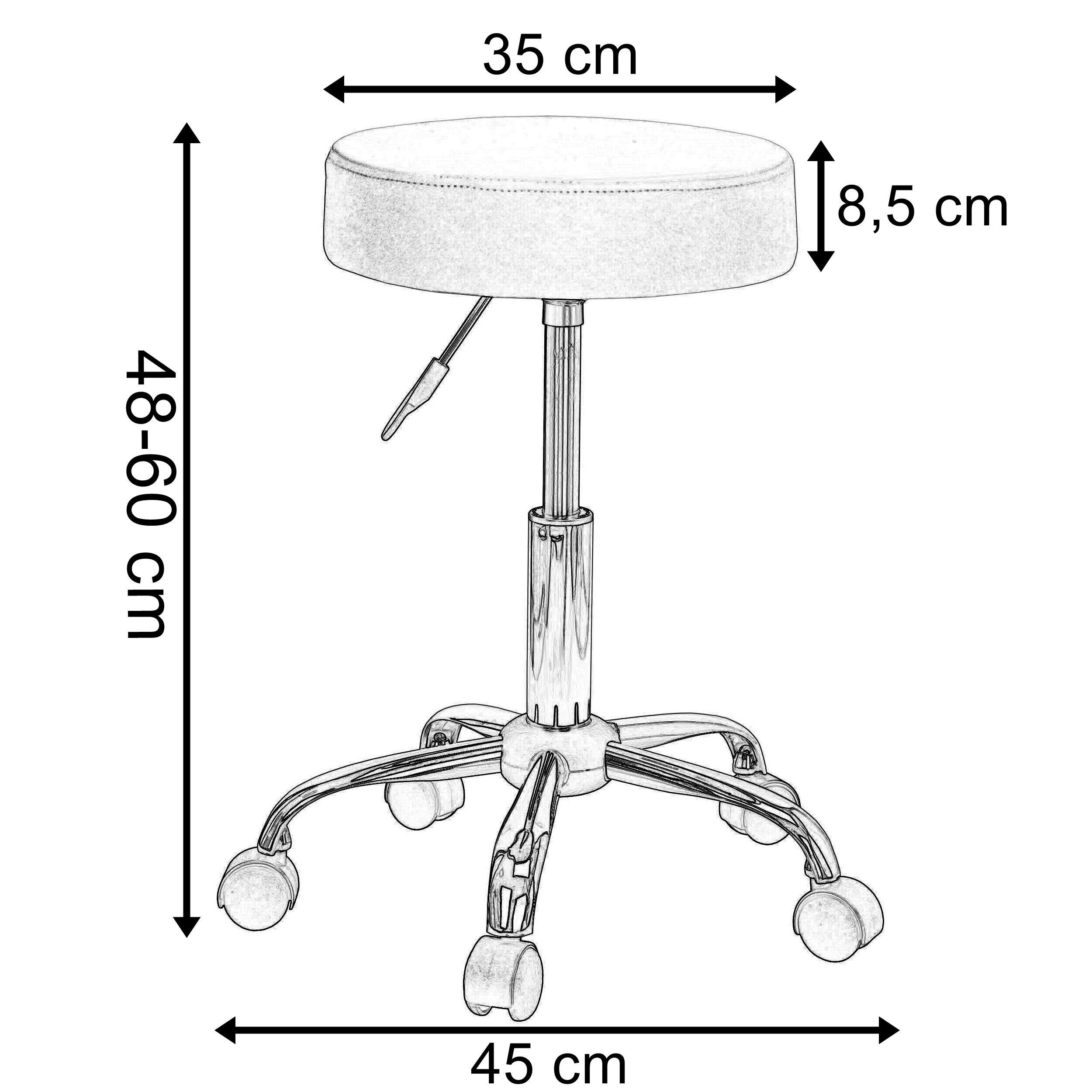 ✅ Regulacja wysokości za pomocą rączki: Dostosowanie wysokości stołka do różnych wysokości stołów lub blatów, co jest kluczowe dla komfortowej i ergonomicznej pracy.