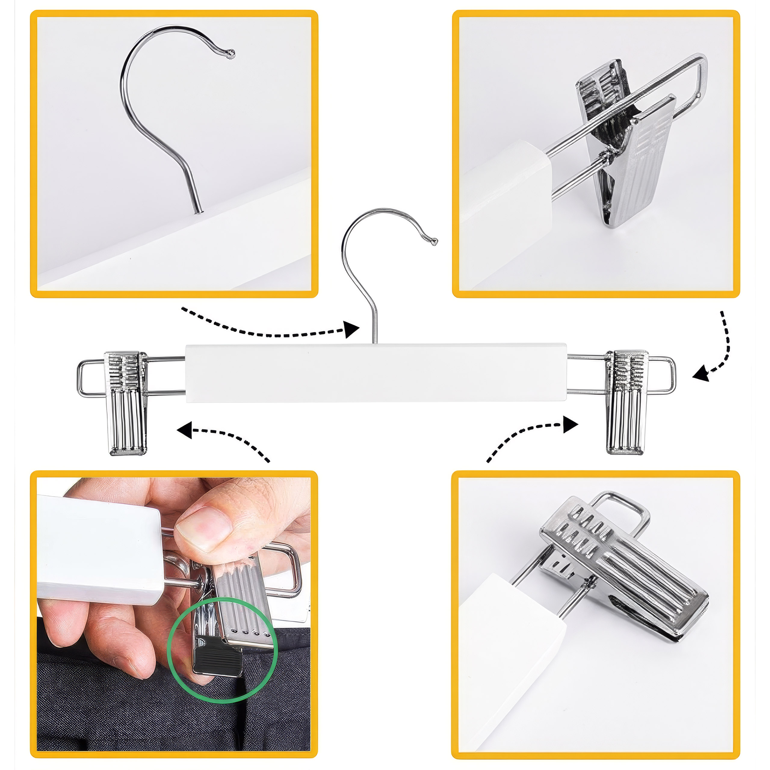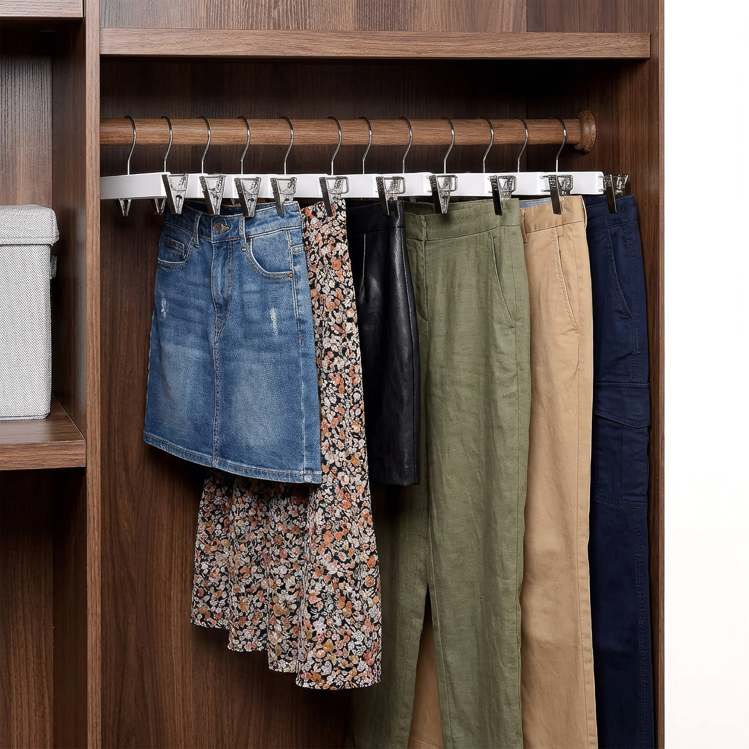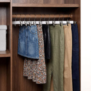 Do tego celu zaprojektowano wieszak drewniany z dwoma klipsami. Wykonany z litego drewna, trwały i mocny-pozwoli zaoszczędzić sporo przestrzeni w szafie i uporządkować Twoją garderobę. Został dodatkowo polakierowany, dzięki czemu zyskał dodatkowe zabezpieczenie od wilgoci oraz gładką powierzchnię. Jest w pełni bezpieczny nawet dla delikatnych ubrań. Rozstaw klipsów można dowolnie zmieniać. Organizer z klipsami sprawdzi się świetnie zarówno w przypadków spódnic jak i spodni.
