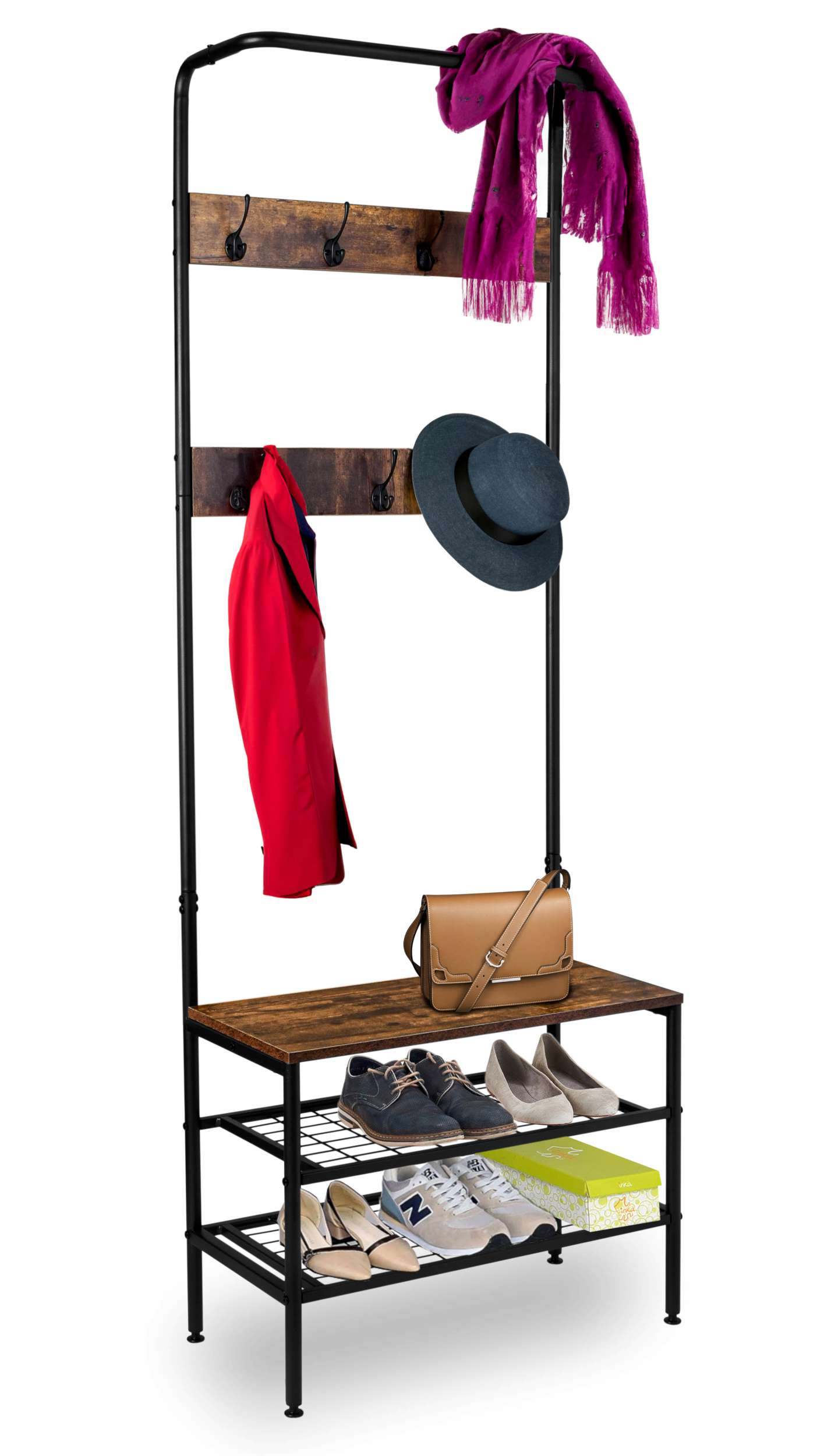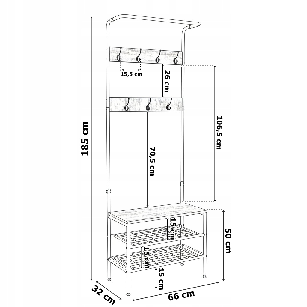 Szukasz unikalnego wieszaka, który praktycznie pomieści ubrania i obuwie, dodając uroku przestrzeni? Nasz designerski wieszak stojący Odrys to harmonia funkcjonalności z estetyką. Idealny dla utrzymania porządku – górna belka może służyć jako dodatkowy wieszak, dwie drewniane poprzeczki z metalowymi hakami doskonale pomieszczą różne akcesoria. Stelaż z malowanej proszkowo stali gwarantuje trwałość, dolne stopki umożliwiają dopasowanie do przestrzeni. Wieszak oferuje miejsce na odzież i dwie półki na obuwie. Wygodne siedzisko z laminowanej płyty w kolorze dębu ułatwia codzienne czynności i dodaje uroku. Pasuje do wnętrz nowoczesnych, loftowych i rustykalnych.