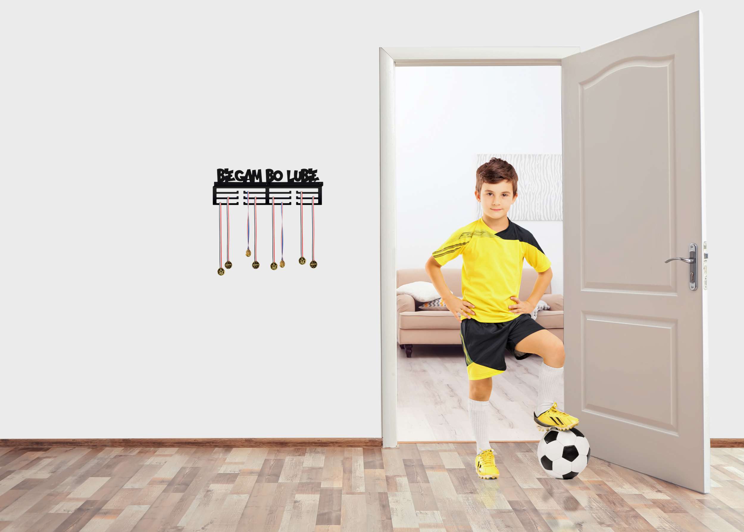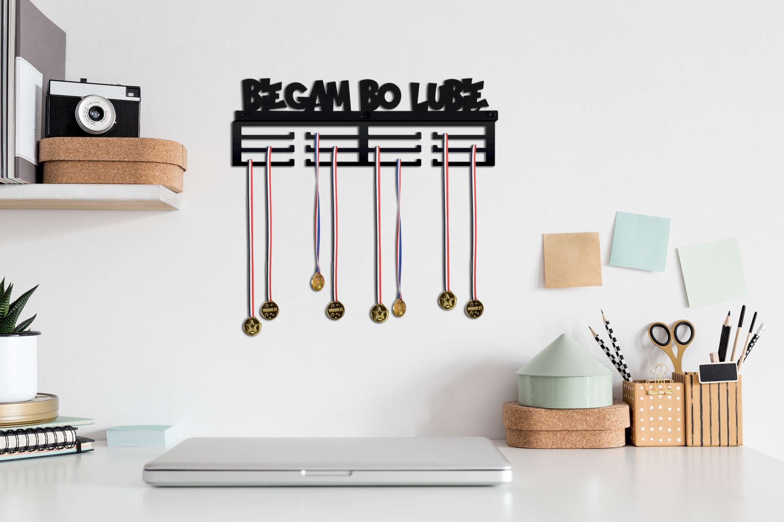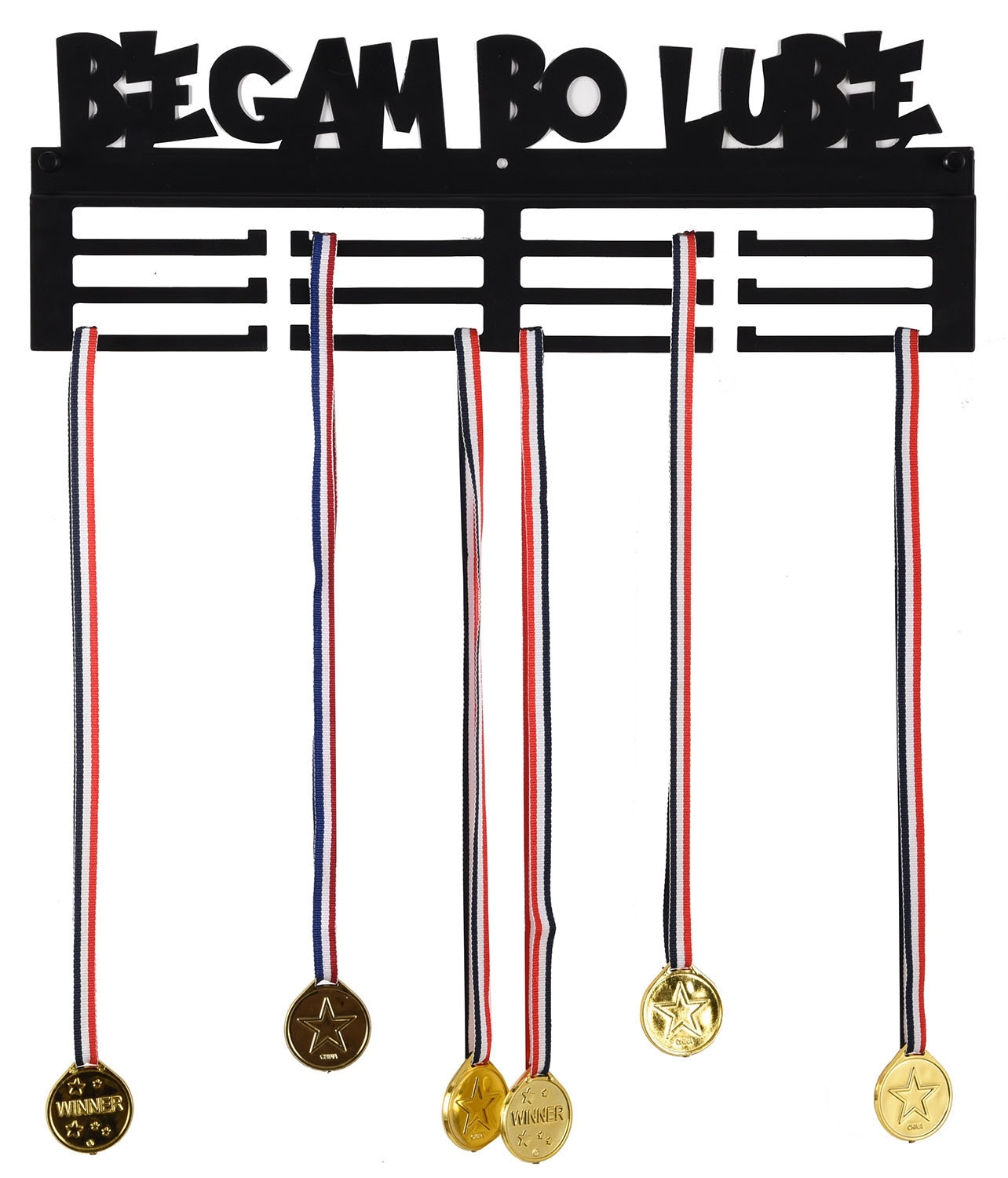 Doskonały pomysł na prezent. Wieszak na medale to najmodniejszy gadżet do pokoju zarówno dzieci jak i dorosłych! Bardzo estetycznie wykonany, literki wycinane sa bowiem laserowo. Metalową konstrukcję zabezpieczono proszkowo matowym lakierem w czarnym kolorze. Dwanaście uchwytów pomieści od sześćdziesięciu do stu medali.