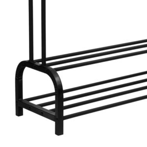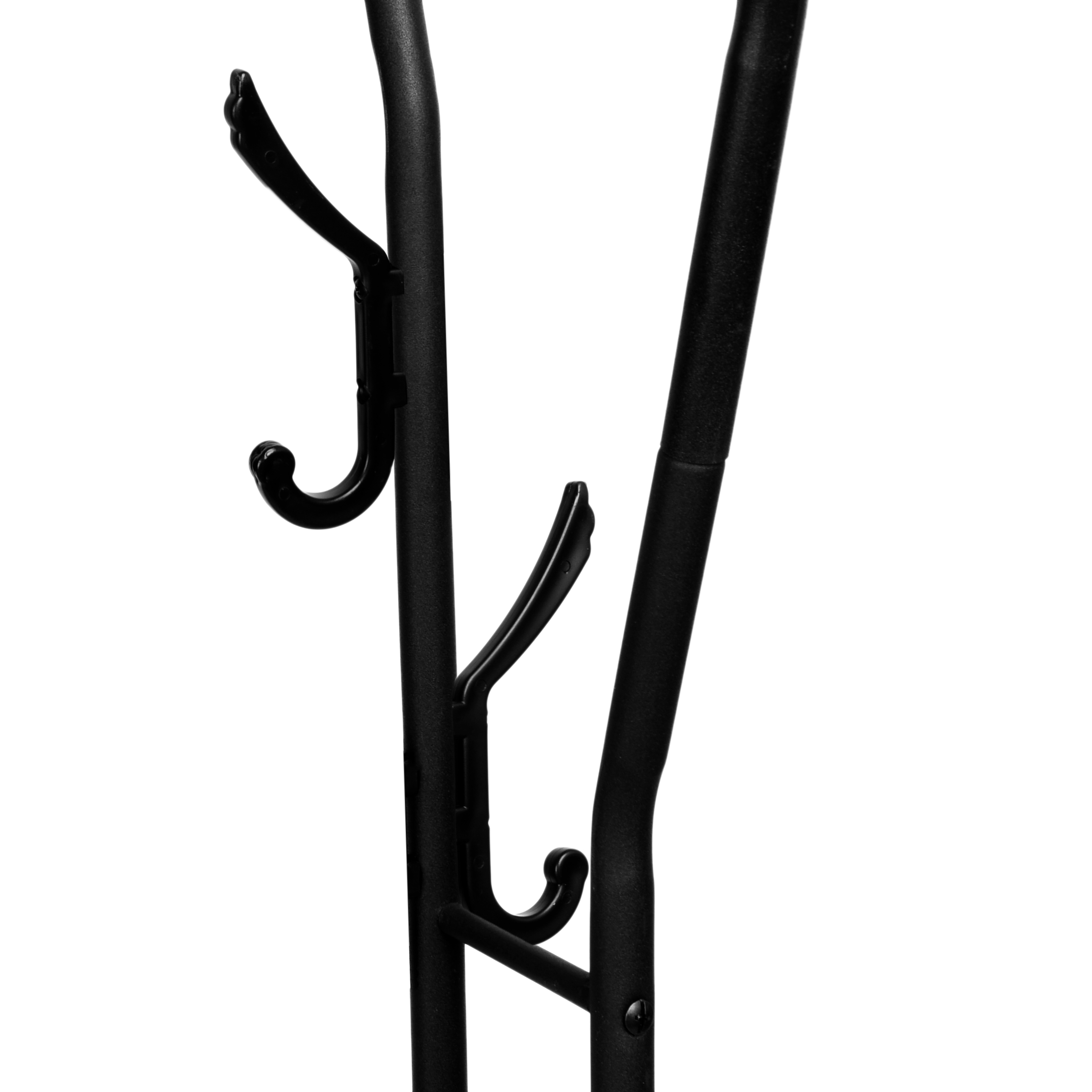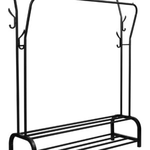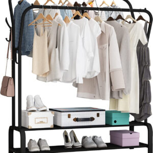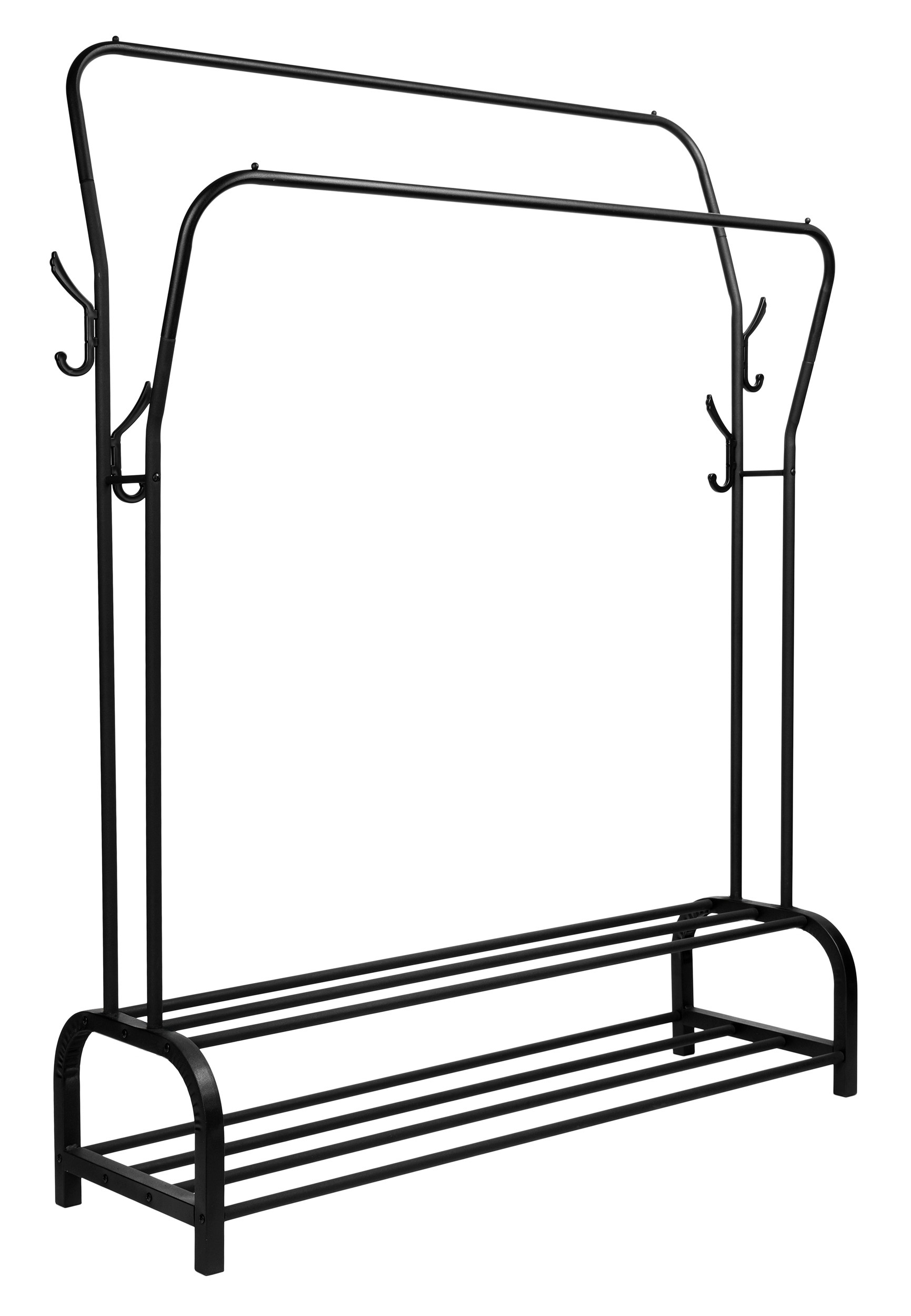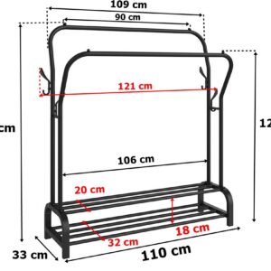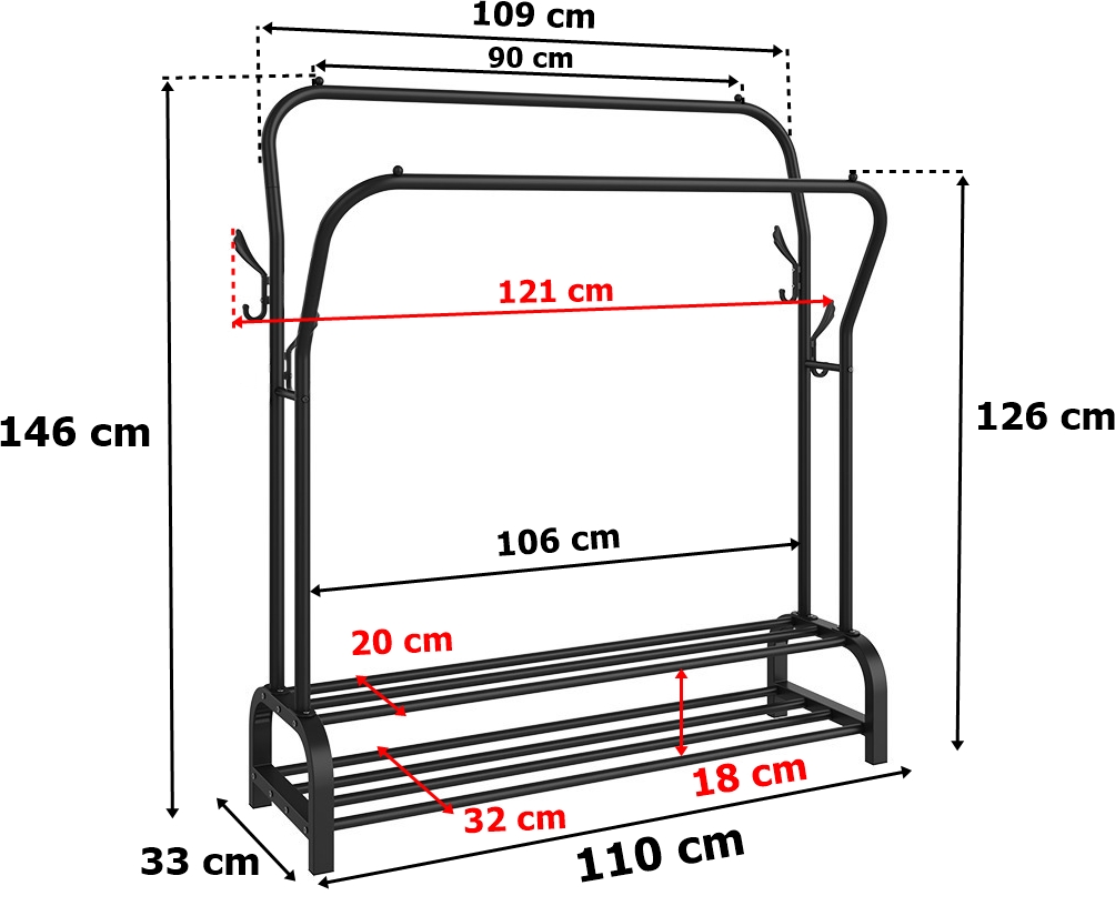Wieszak garderobiany Lary to idealne rozwiązanie dla osób, które potrzebują dużo miejsca na przechowywanie swoich ubrań i akcesoriów. Ten podwójny wieszak garderobiany wyposażony jest w dodatkowe haczyki na akcesoria oraz dolne półki, które pozwalają na przechowywanie butów i innych przedmiotów. Konstrukcja wieszaka wykonana jest z solidnych stalowych rurek, które zostały malowane proszkowo na matowy czarny kolor, zapewniając mu stabilność i wytrzymałość. Dodatkowo, dwie poziome główne rurki posiadają blokady przed zsuwaniem się ubrań, co zapobiega nieporządkowi i zapewnia ładny wygląd garderoby. Wieszak Firma to model wielofunkcyjny i praktyczny, wykonany z materiałów najwyższej jakości, dbając o każdy szczegół. Dzięki niemu można pomieścić wiele ubrań i akcesoriów, jednocześnie oszczędzając cenną przestrzeń w garderobie.