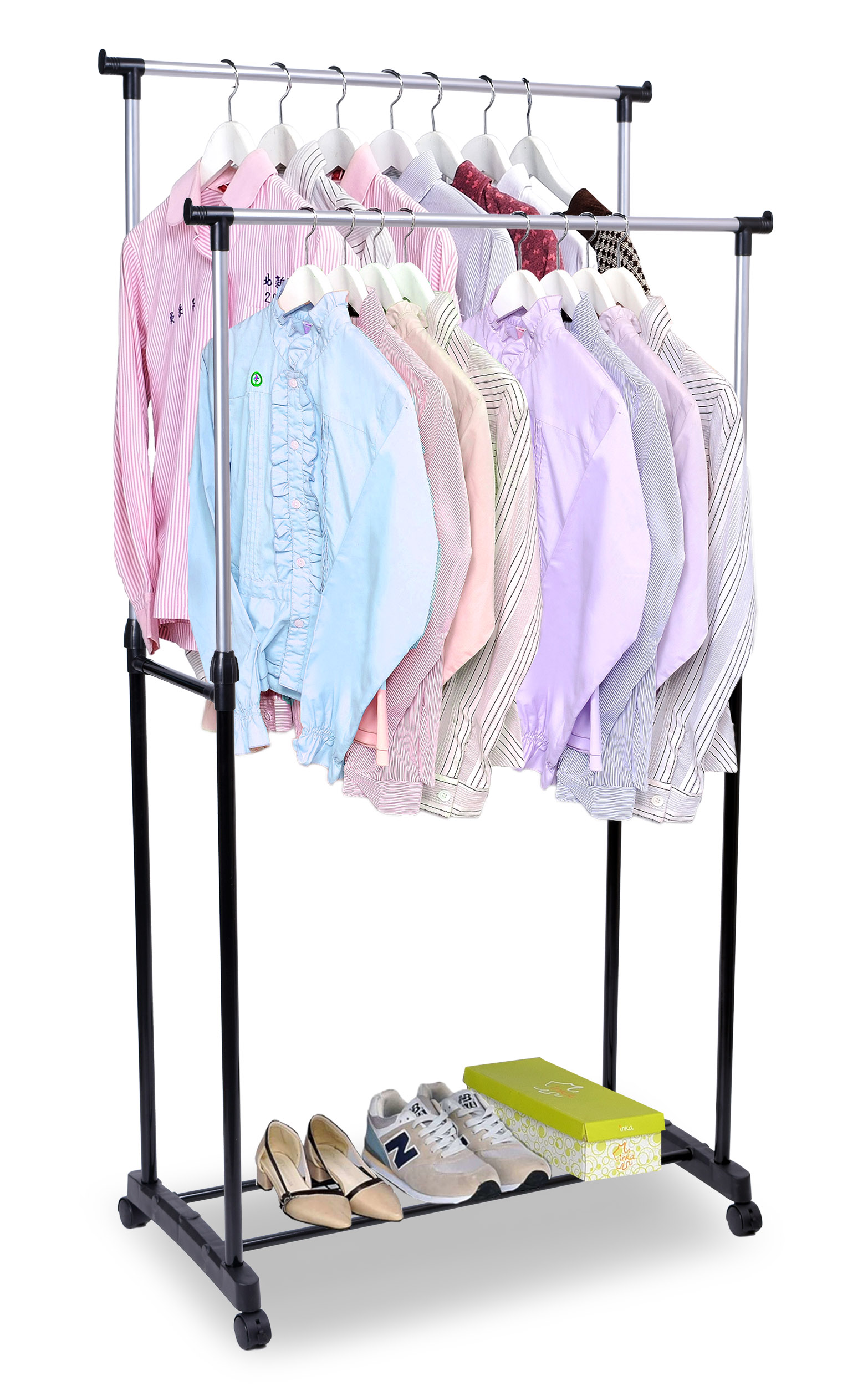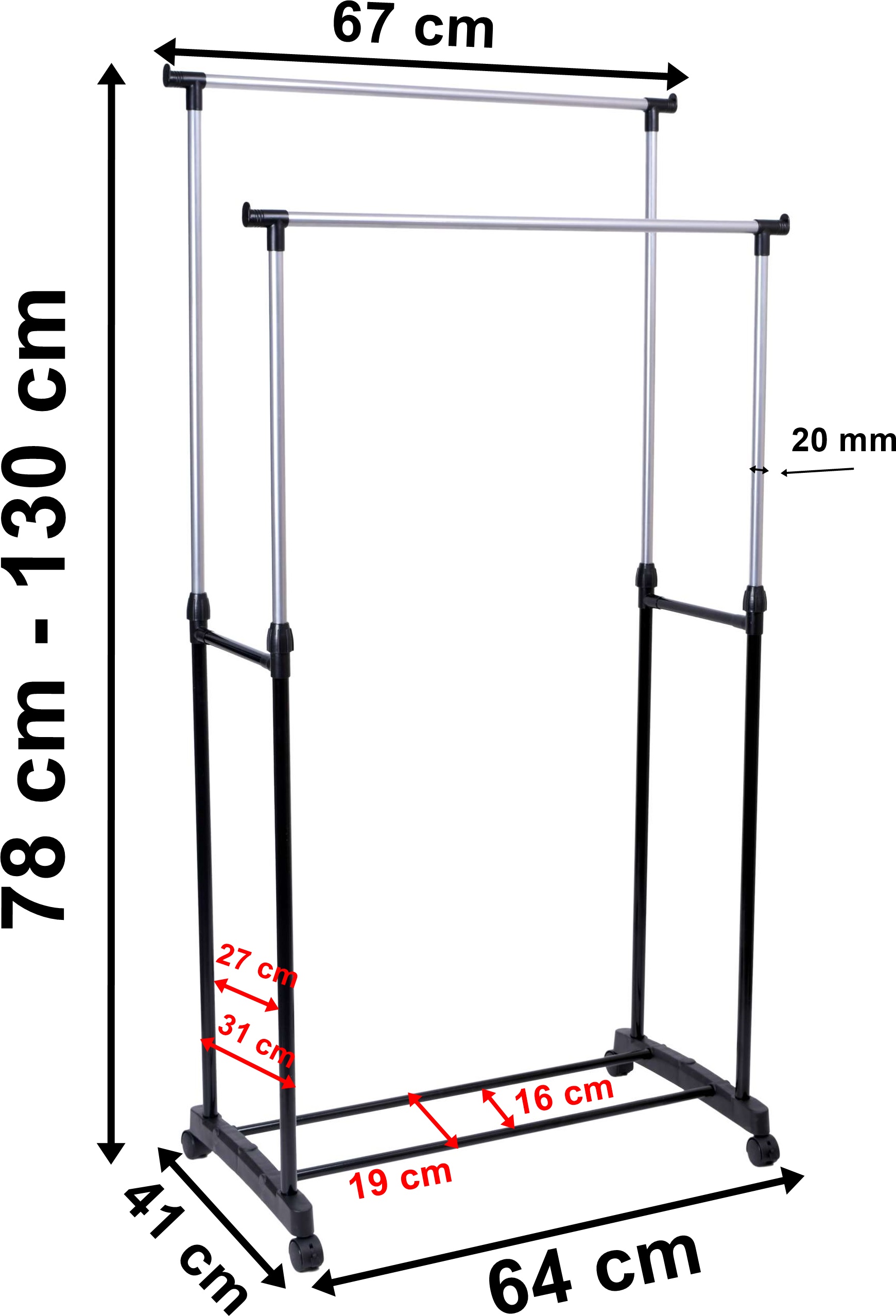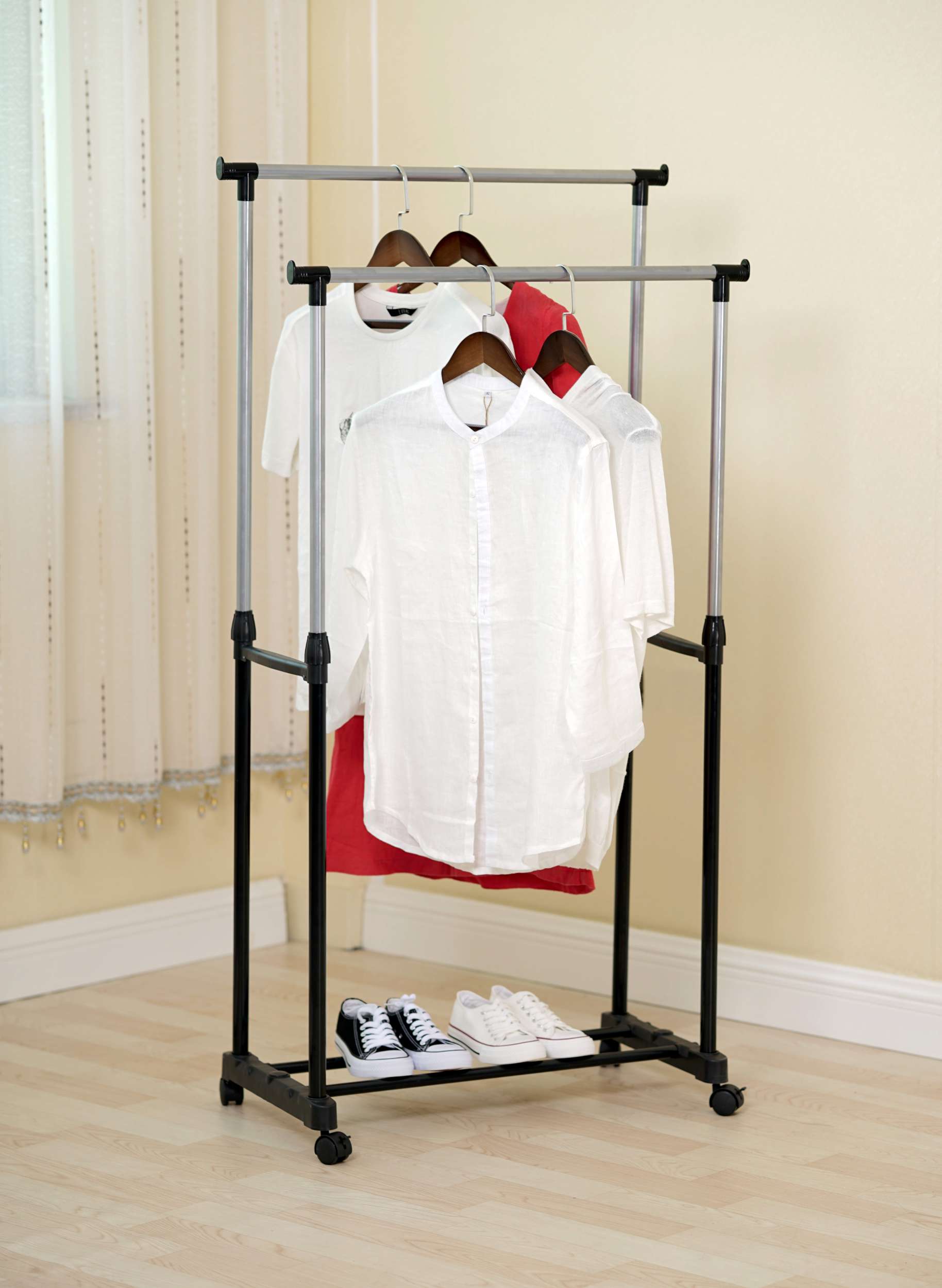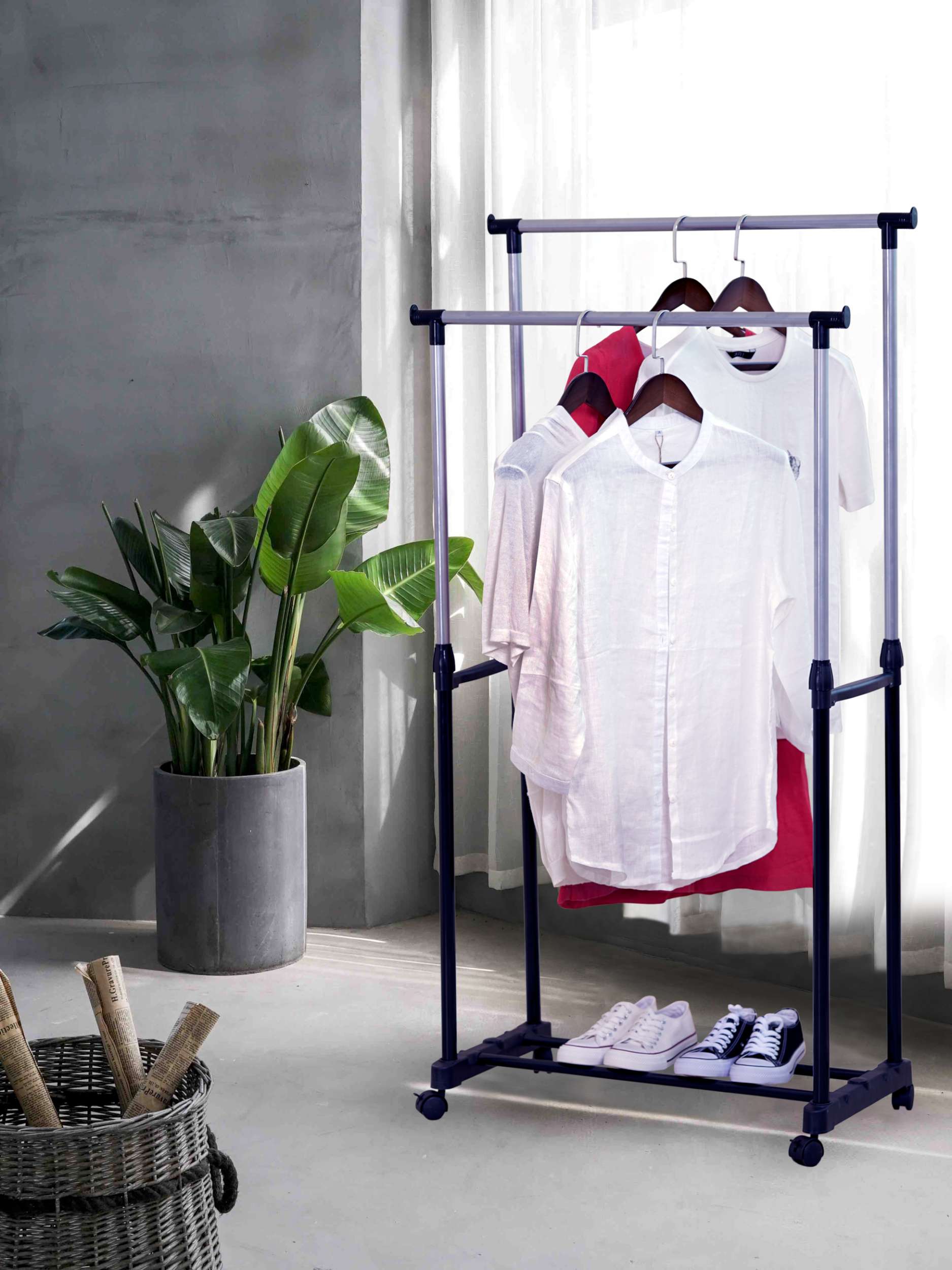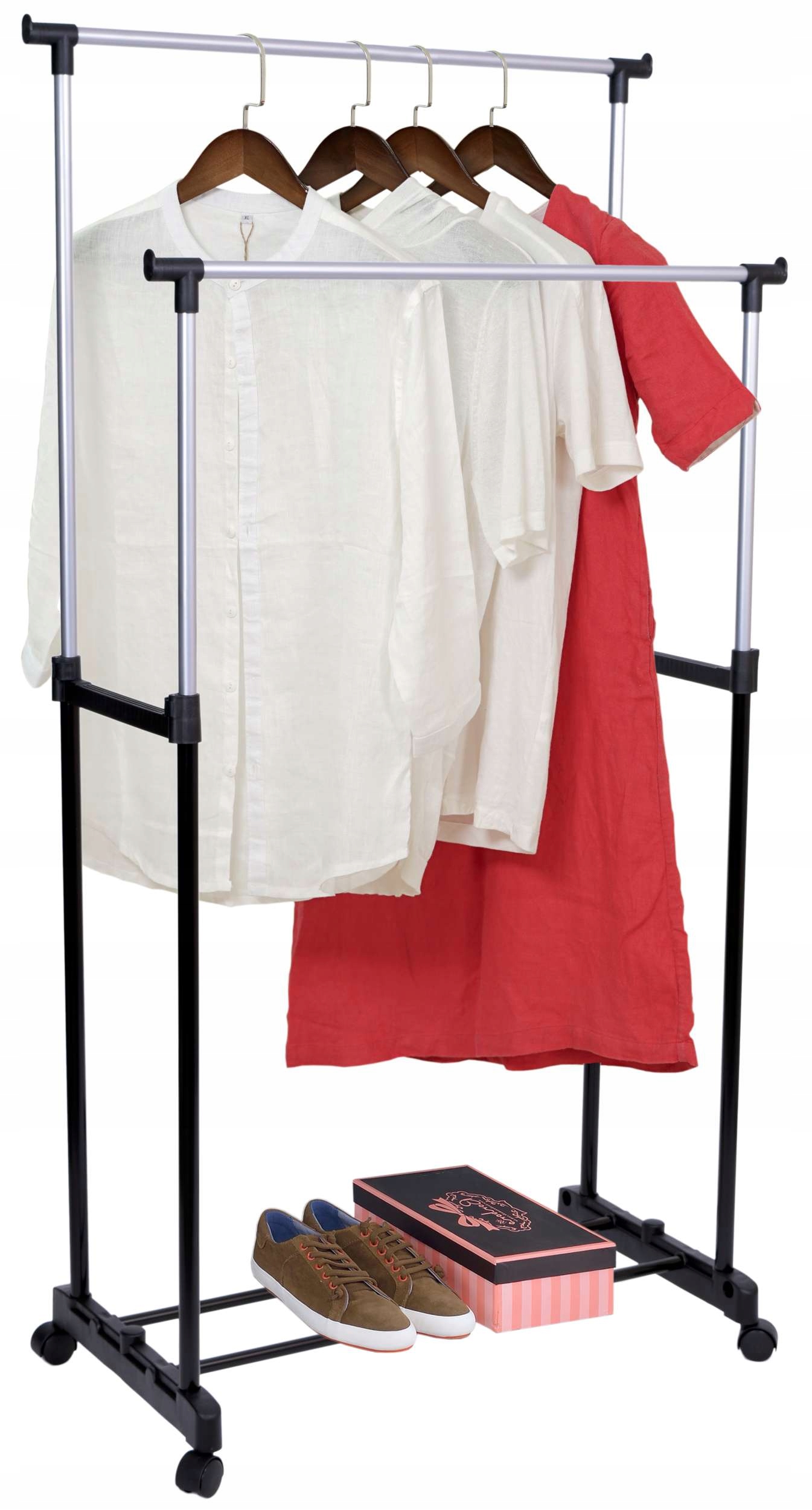 Oferujemy praktyczny i wytrzymały wieszak garderobiany na kółkach MIA. Wieszak sprawdzi się w każdym domu i w biurze, w którym brakuje miejsca do powieszenia odzieży. Nasz produkt został wyposażony w podwójny drążek, którego wysokość można łatwo regulować za pomocą zacisków oraz kółka umożliwiające wygodne przemieszczanie. Dodatkowym atutem wieszaka są nakładki na końce drążka uniemożliwiające zsunięcie się wieszaków z odzieżą. Montaż wieszaka jest niezwykle prosty i nie wymaga użycia narzędzi.