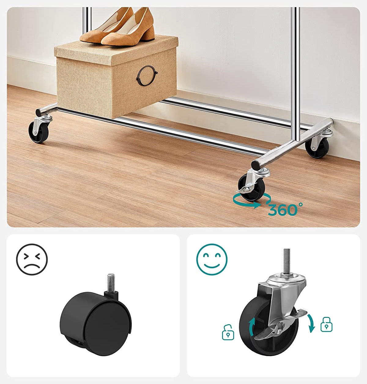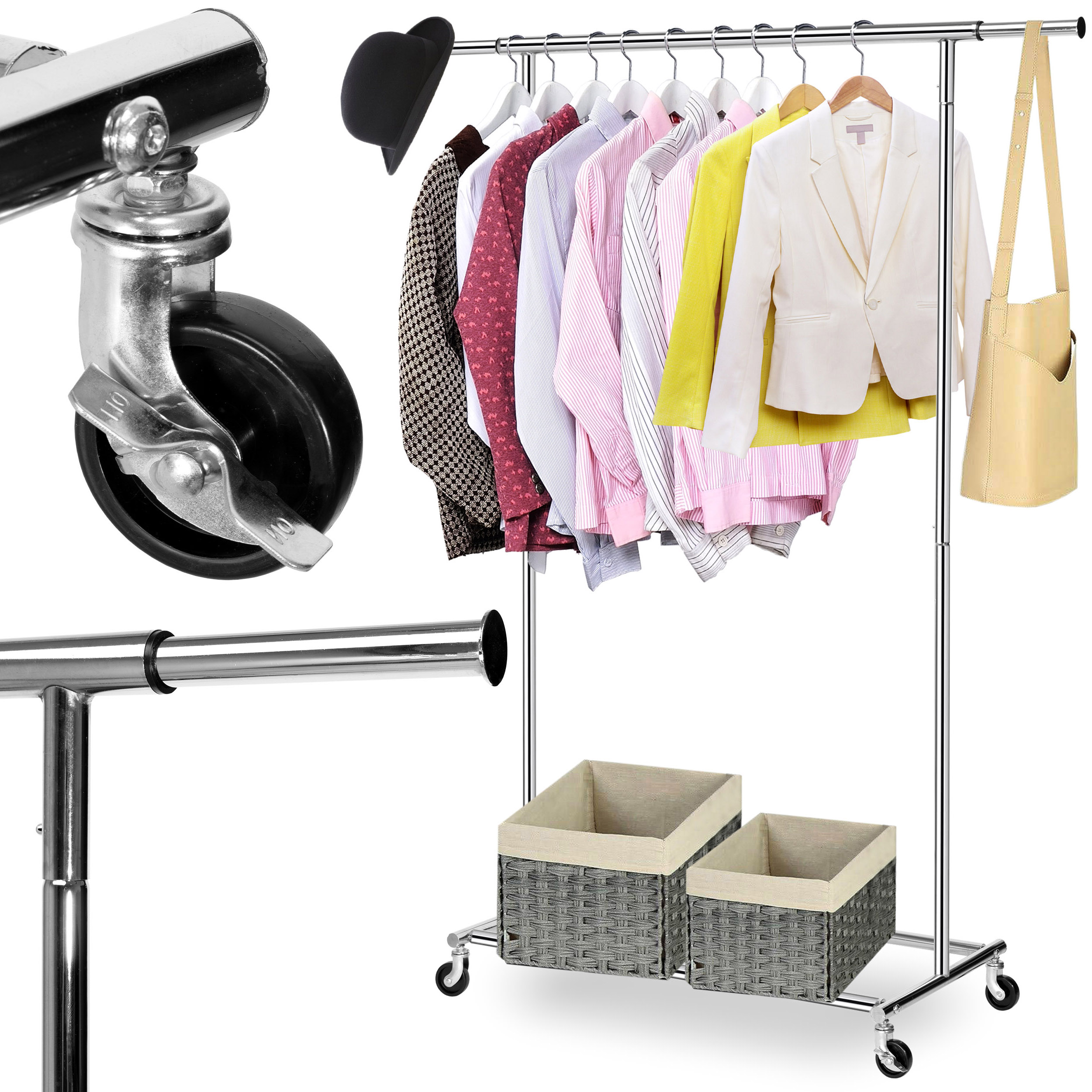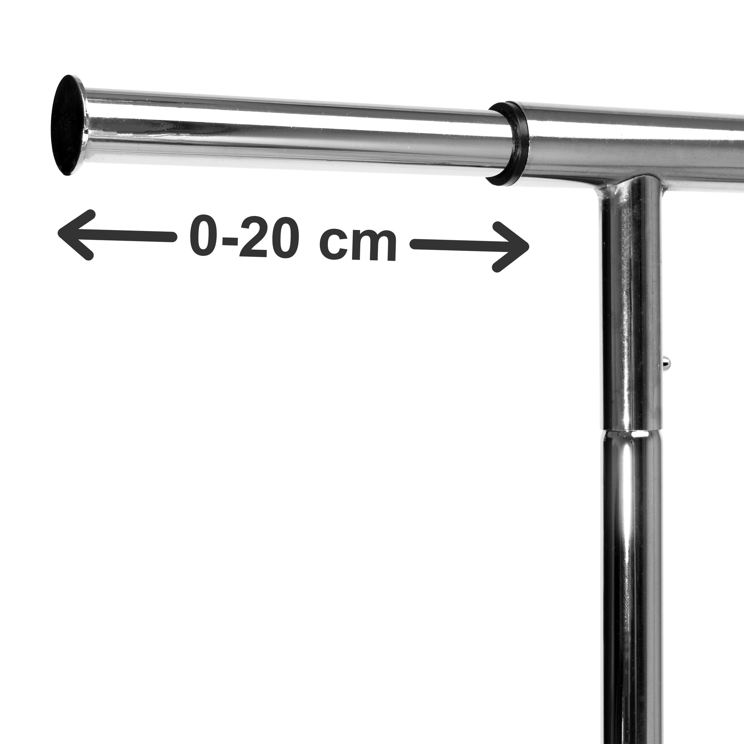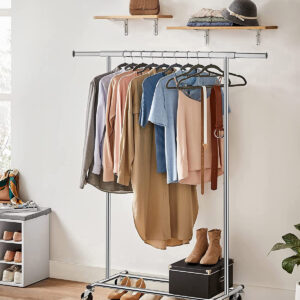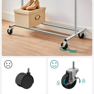 Wieszak Tahir to praktyczny i wytrzymały wieszak stojący na kółkach z wysoką odpornością, wykonany ze stali chromowanej. Posiada wbudowane hamulce i możliwość regulacji bocznych ramion w zakresie do ok. 20 cm, co umożliwia rozszerzenie wieszaka do szerokości 132 cm. Wieszak Tahir może unieść nawet 90 kg równomiernego obciążenia, a na dolnym poziomie można łatwo pomieścić pudełka na akcesoria czy kilka par butów.