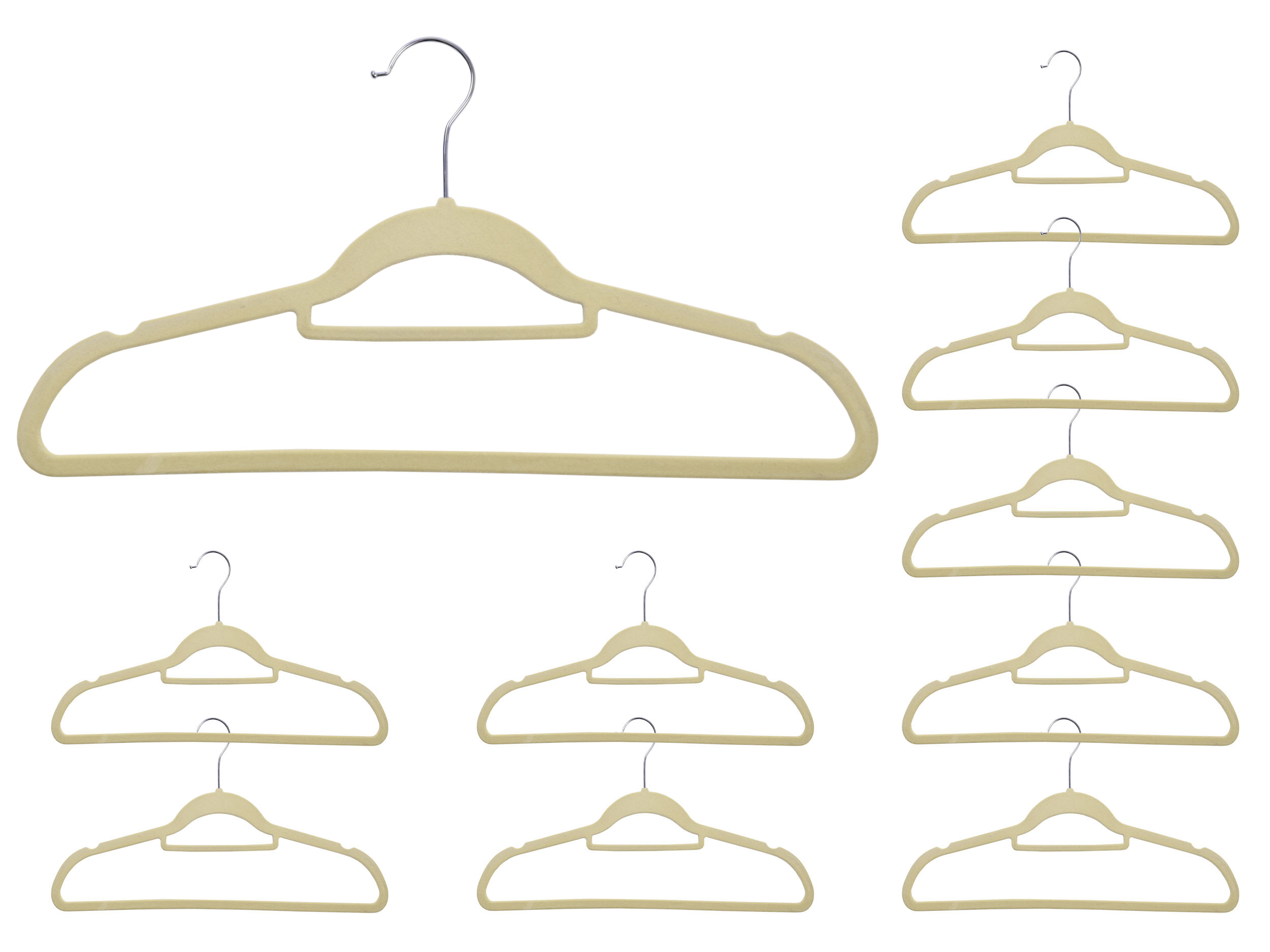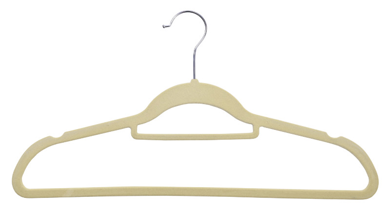 Komplet wieszaków aksamitnych. Flokowana powierzchnia czyni je bardzo praktycznymi, zapobiega bowiem zsuwaniu się ubrań. Wieszaki Maxi są odpowiednio profilowane, co pomaga uniknąć zagnieceń na odzieży.