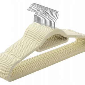 Wieszaki są wykonane z plastiku i w całości pokryte przyjemnym w dotyku welurem, dzięki czemu ubrania nie zsuwają się.