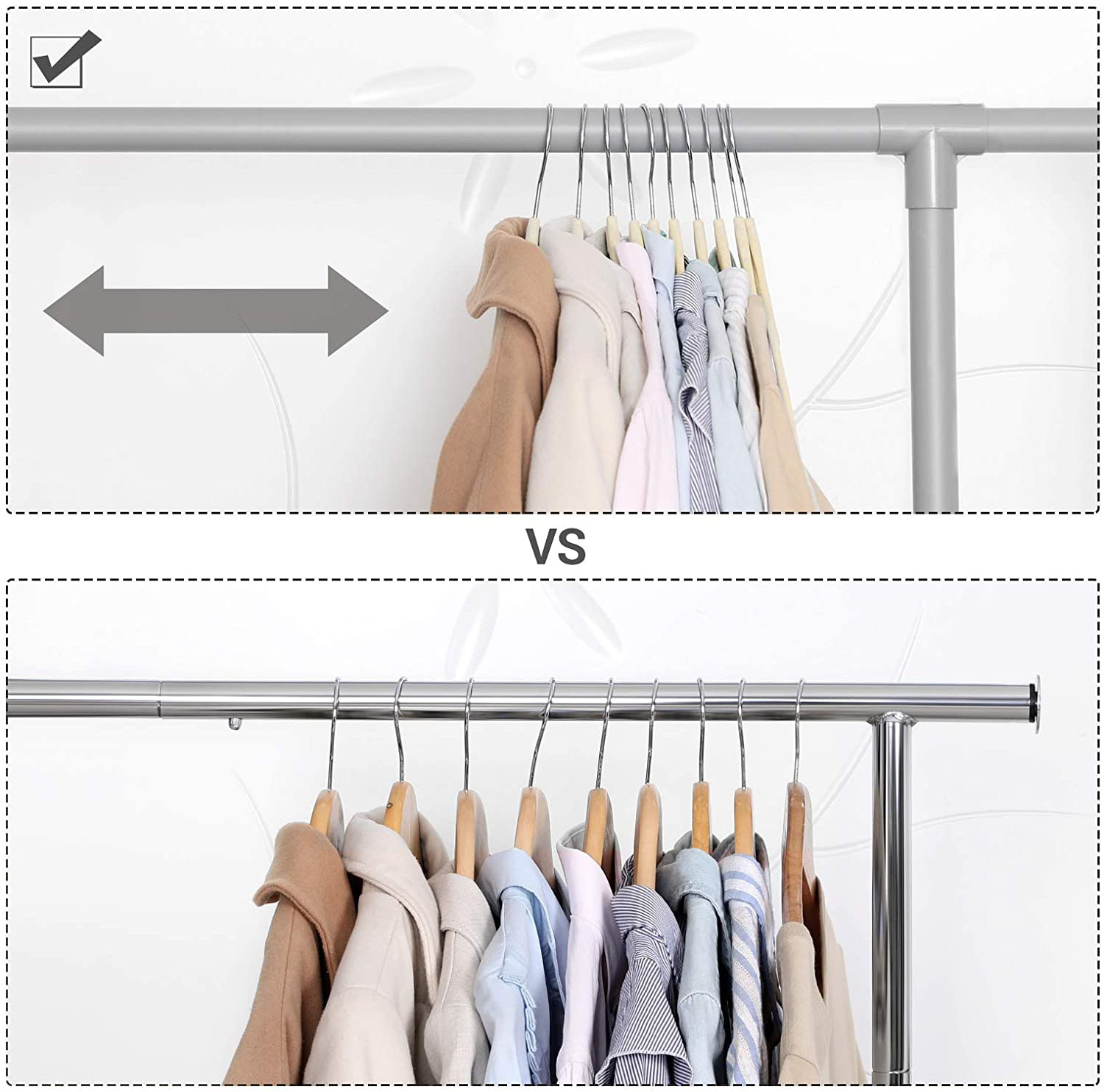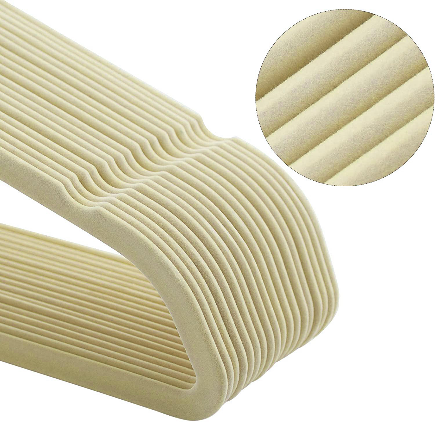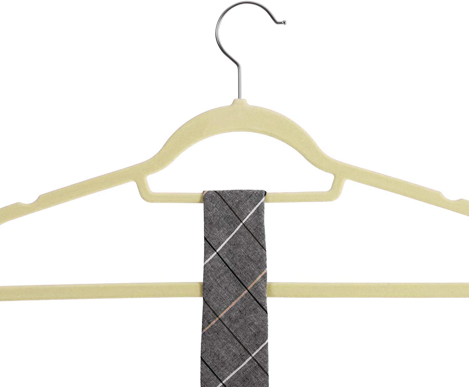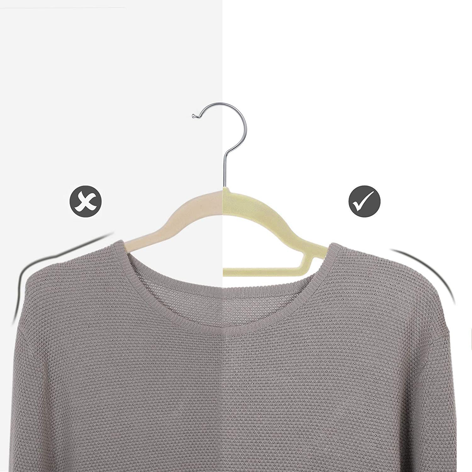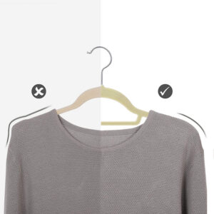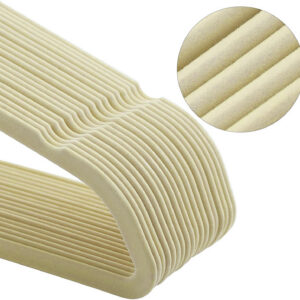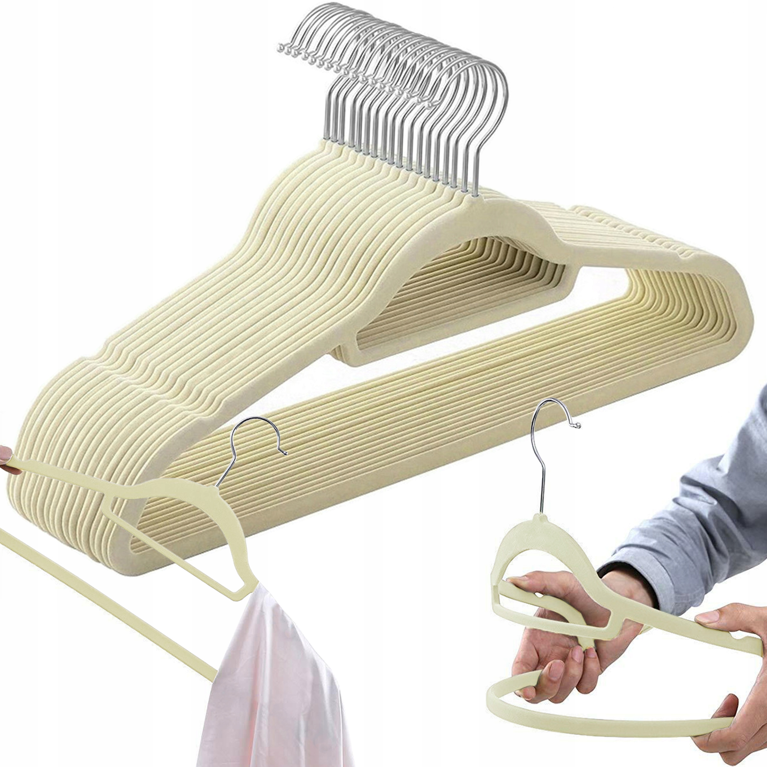 Wieszaki metalowe pokryte miłym w dotyku welurem. Powierzchnia antypoślizgowa zapobiega zsuwaniu się ubrań. Metalowe wnętrze gwarantuje duży udźwig wieszaków- do pięciu kilogramów każdy. Wieszak posiada dwie poprzeczki, mniejsza na dodatki, większa na spodnie. Ramiona z dodatkowymi wcięciami na topy i sukienki o drobnych ramiączkach. Obrotowy hak pozwala zawiesić je wygodnie niemal wszędzie.