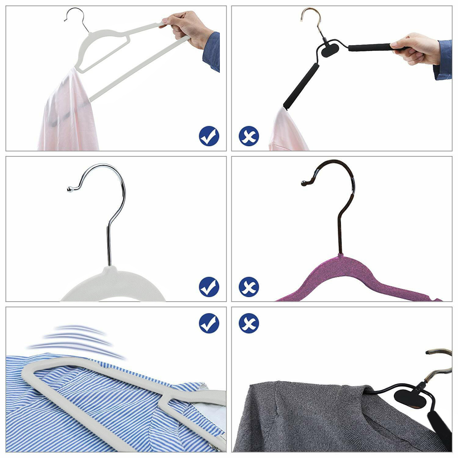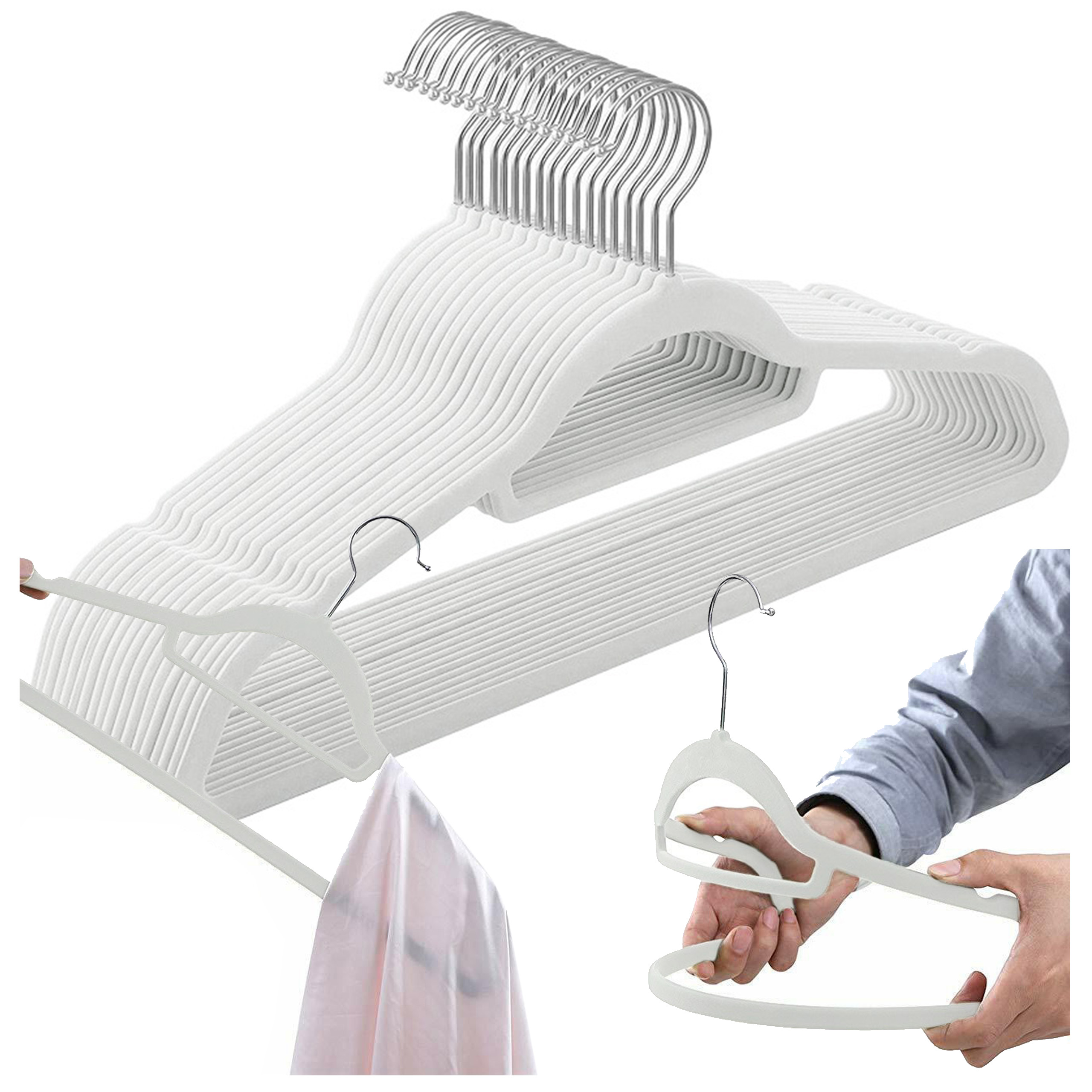 Wieszaki metalowe pokryte miłym w dotyku welurem. Powierzchnia antypoślizgowa zapobiega zsuwaniu się ubrań. Metalowe wnętrze gwarantuje duży udźwig wieszaków- do pięciu kilogramów każdy. Wieszak posiada dwie poprzeczki, mniejsza na dodatki, większa na spodnie. Ramiona z dodatkowymi wcięciami na topy i sukienki o drobnych ramiączkach. Obrotowy hak pozwala zawiesić je wygodnie niemal wszędzie.
