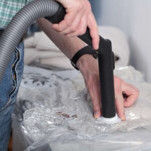 Odsysaj powietrze odkurzaczem, którego wąż pasuje do zaworu worka.