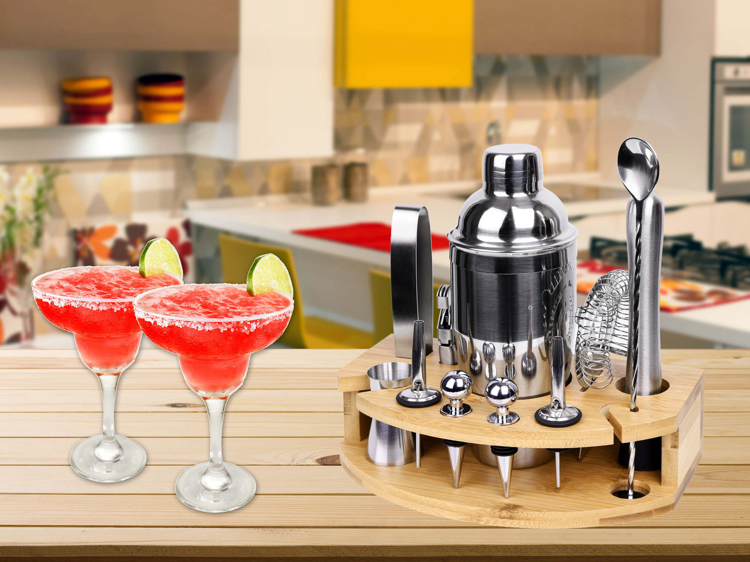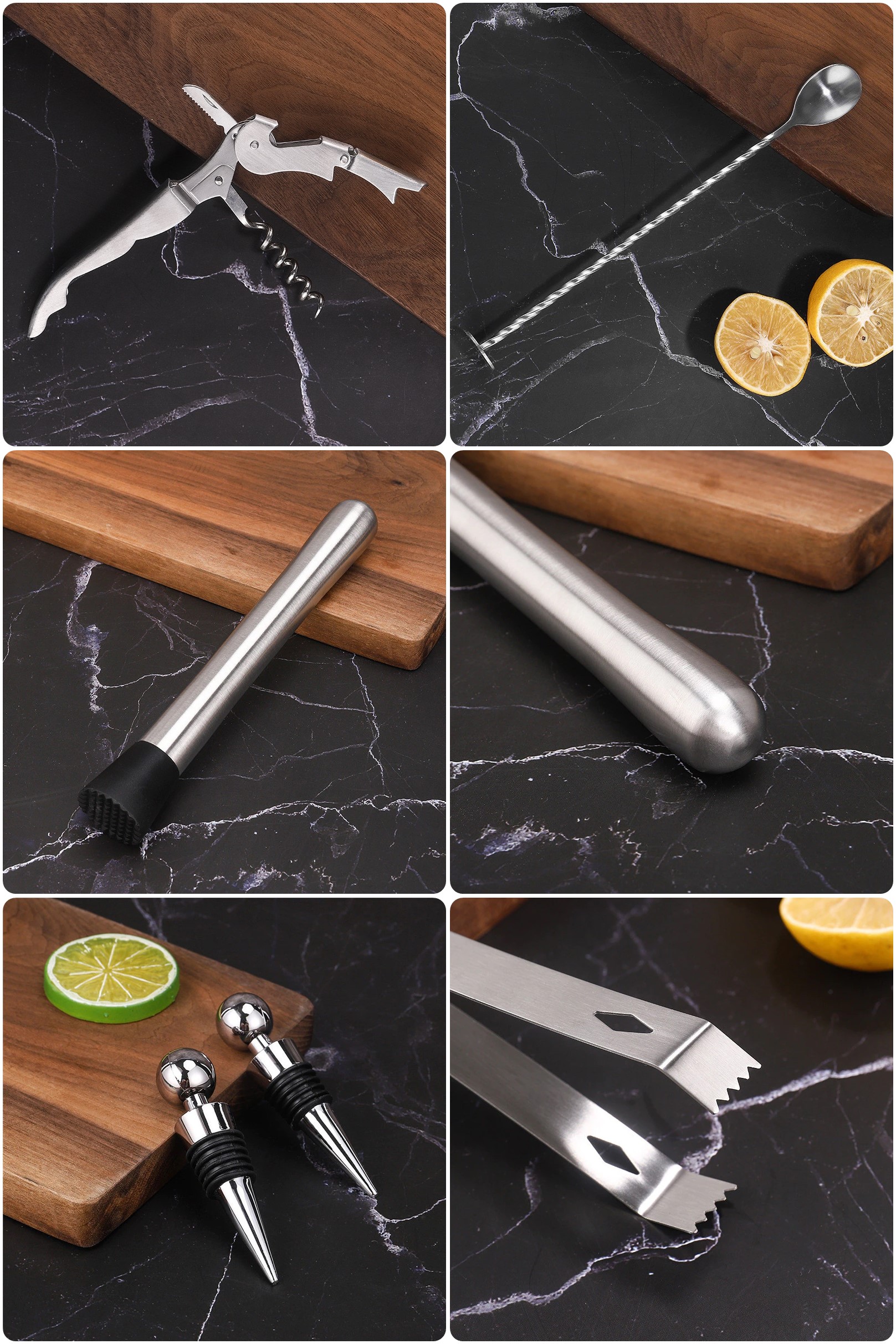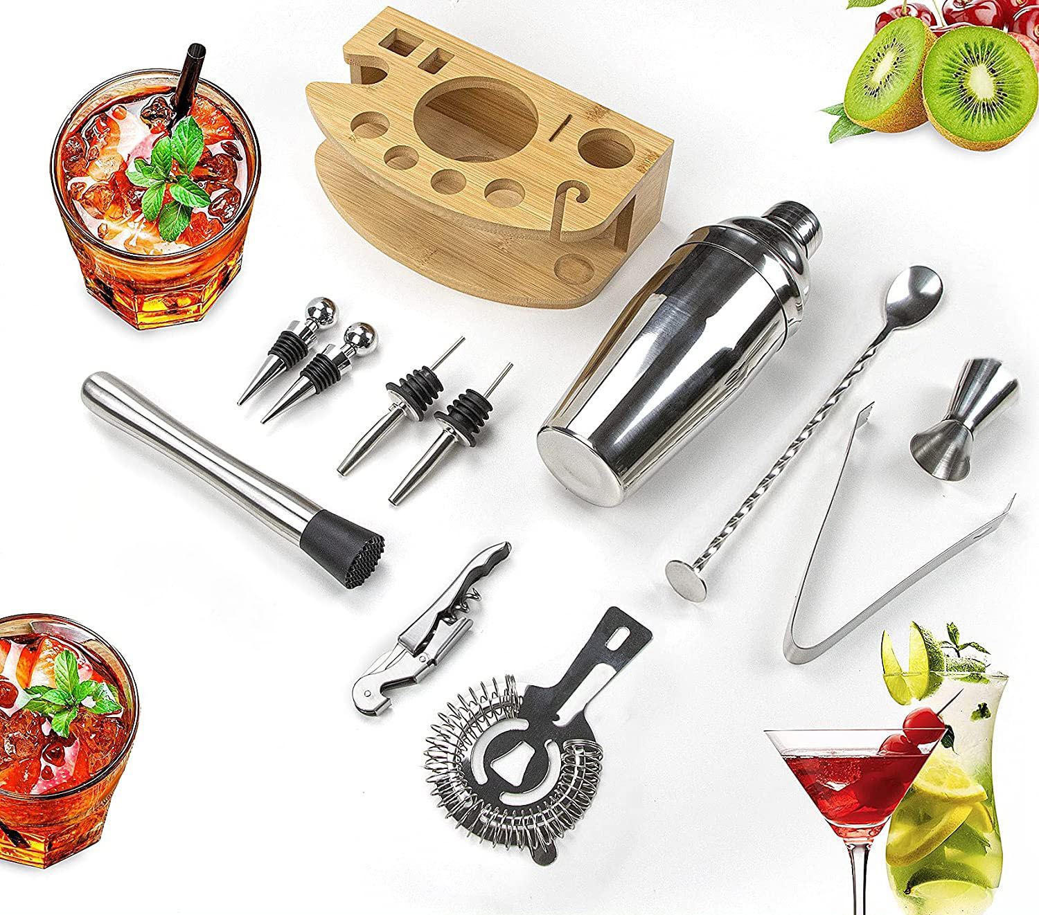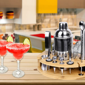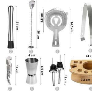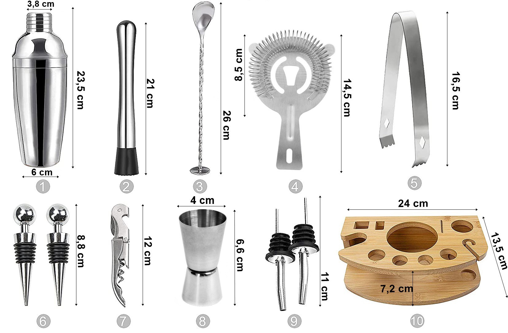 W calości wykonany z najwyższej jakości stali szlachetnej, dzięki czemu nie zmienia smaku napojów. W zestawie aż 12 elementów: 11 akcesoriów ze stali nierdzewnej oraz bambusowy stojak.