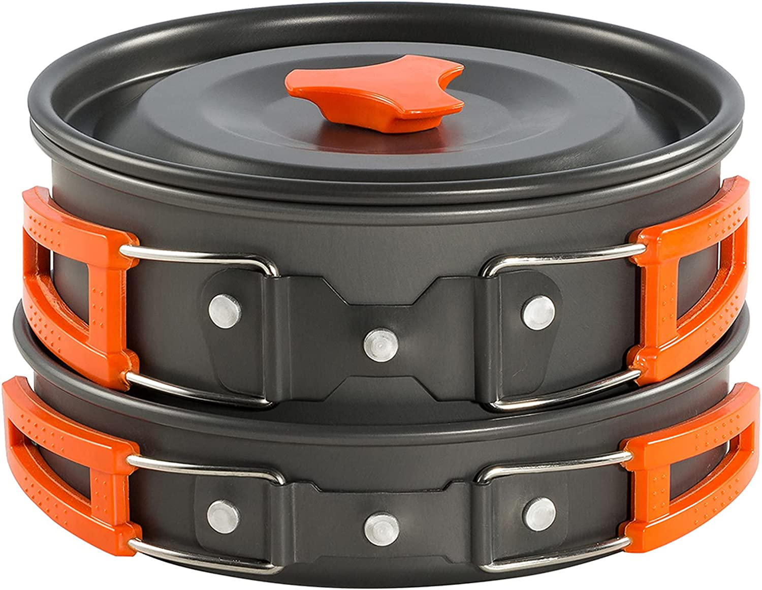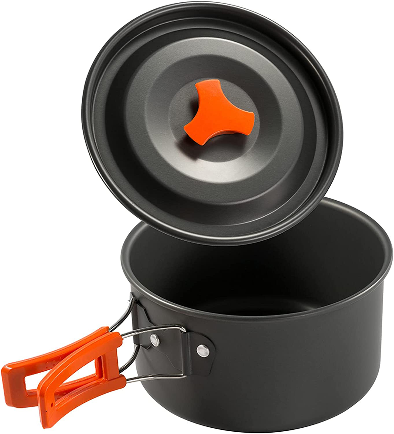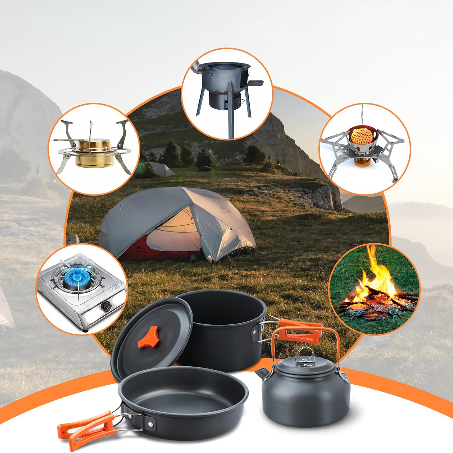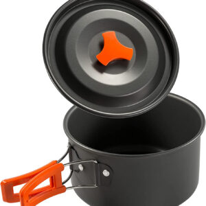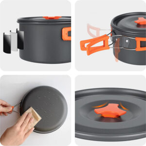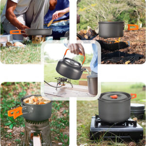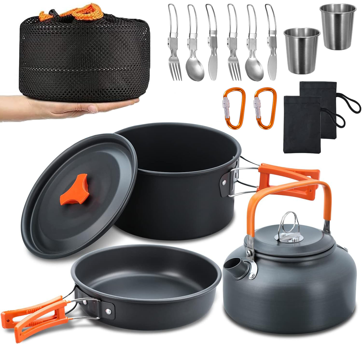Zawartość zestawu: Garnek z pokrywką, czajnik z pokrywką, patelnia, 2 kubeczki, siatkowany worek, 2 pokrowce do sztućców, 2 łyżki, 2 widelce, 2 noże, 2 karabińczyki